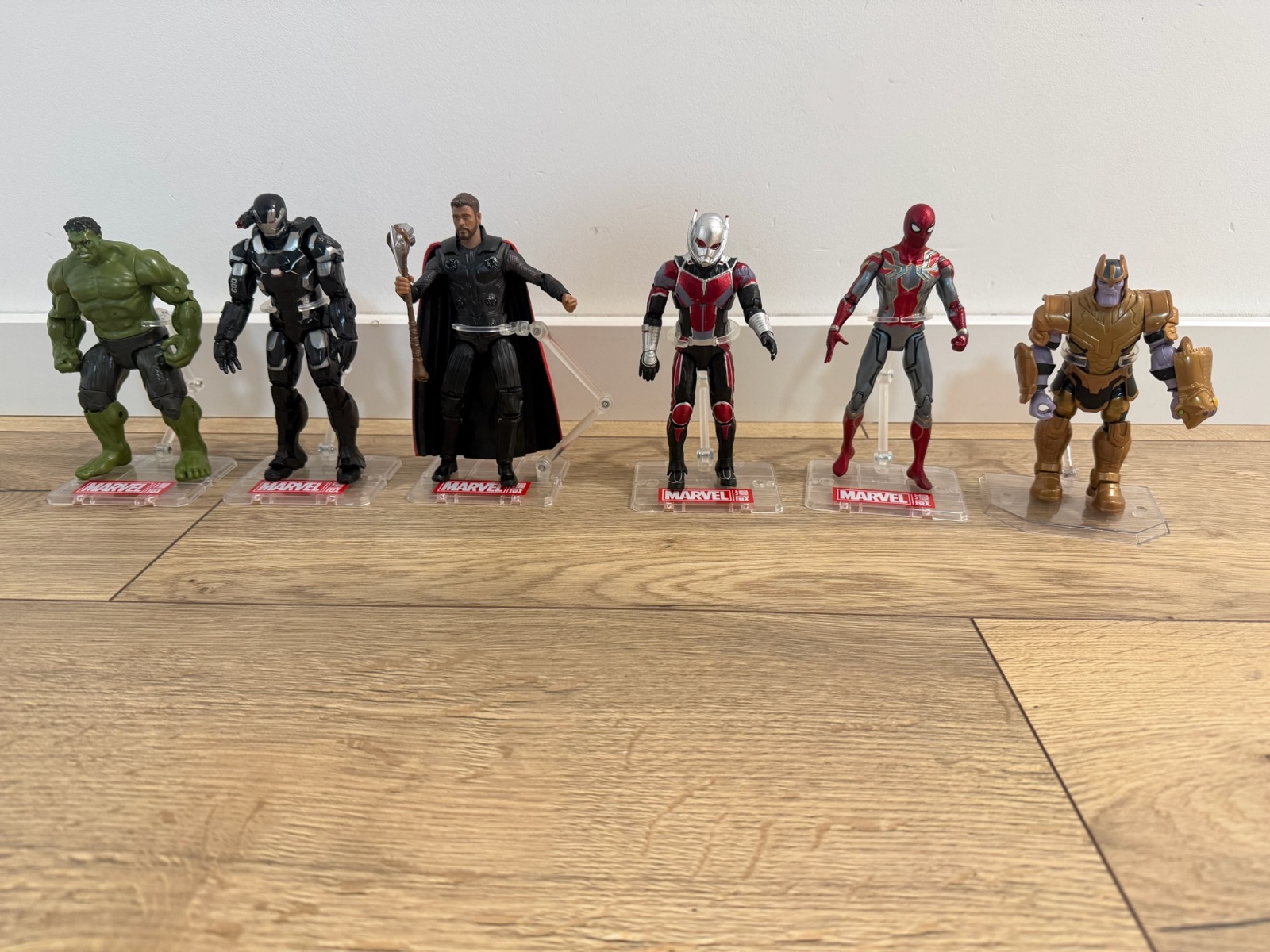 Figúrky sú veľmi zachovalé, povedal by som že ako nové, akurát spiderman nemá tie spider ramená, detailné, pekné a kvalitné, ohybné kĺby, sú zo stojanom, výška 17 cm, cena za kus je 15 eur, spiderman za 10 eur