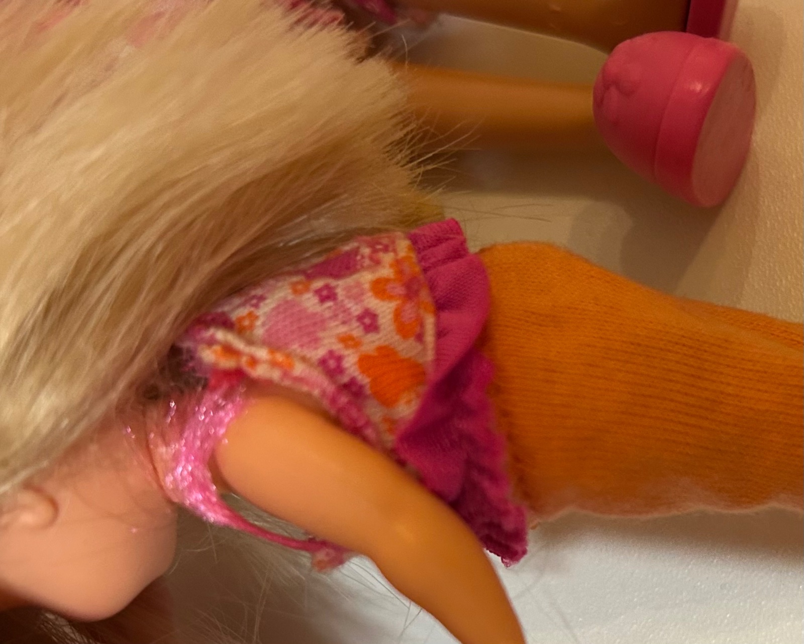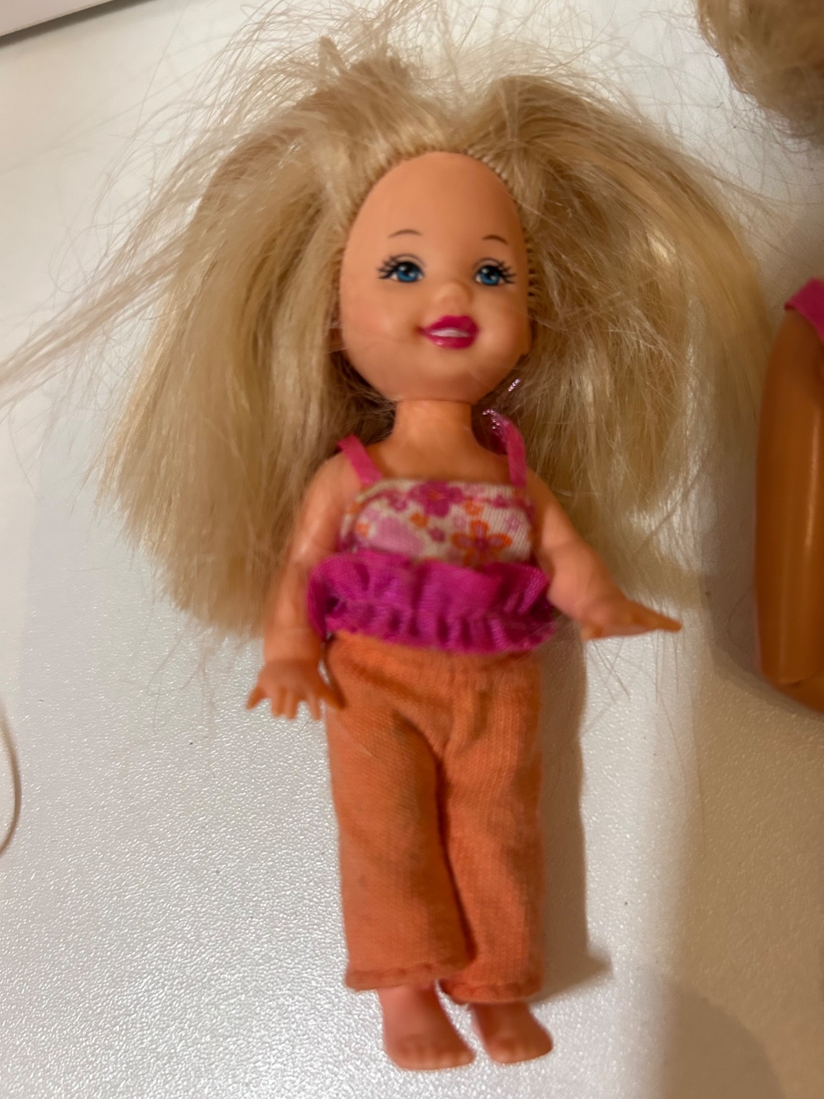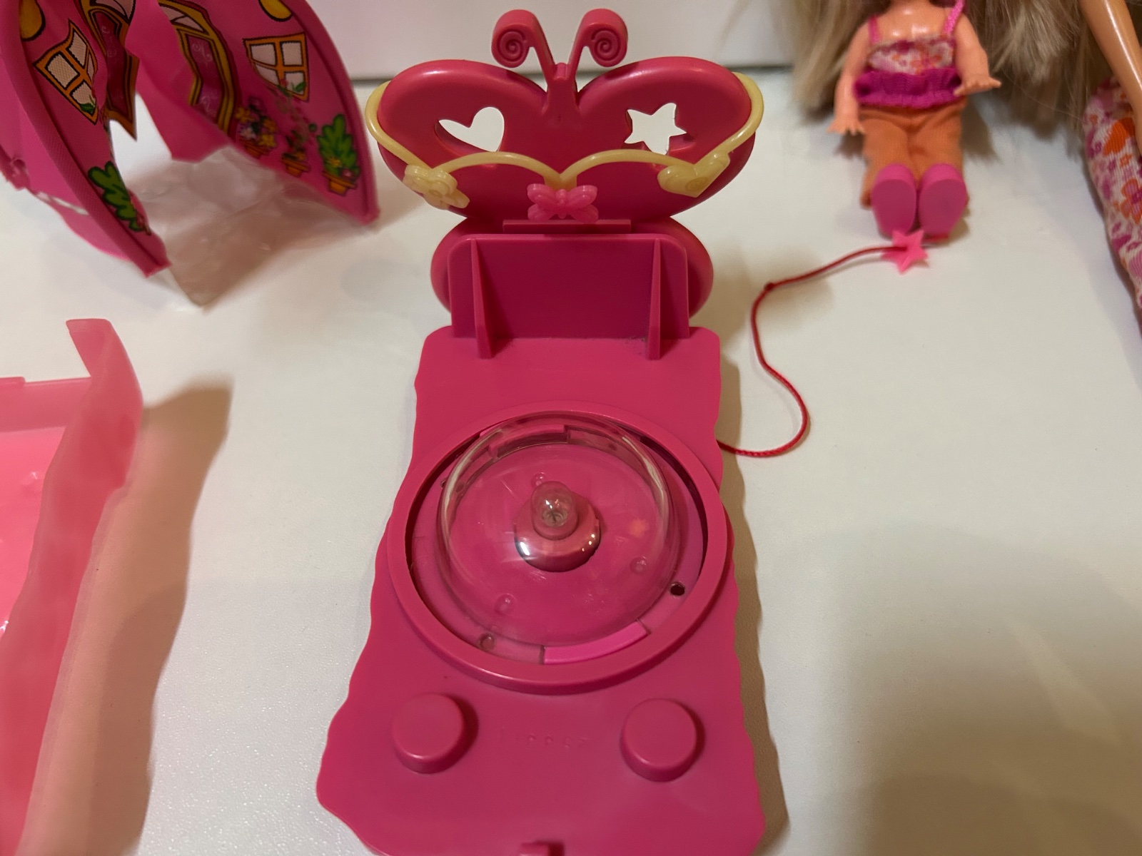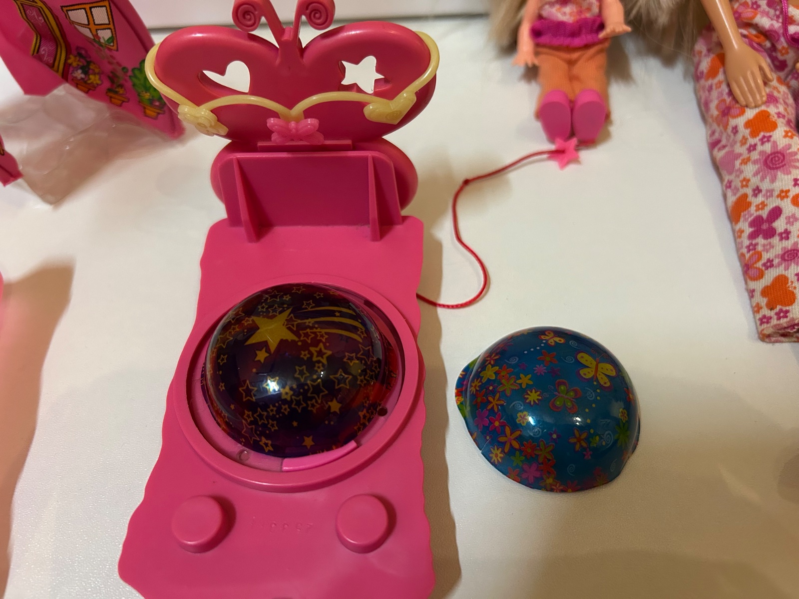 Malá bábika má na tričku skoro pretrhnutú šnúrku- ako na fotke, trošku špinavé nohavice - na vyžiadanie môžem oprať. Posteľ by mala svietiť a točiť sa, no neviem či ešte funguje - neskúšala som, na vyžiadanie môžem skúsiť. Majú rozpustené copy. Inak stav ako na foto.
