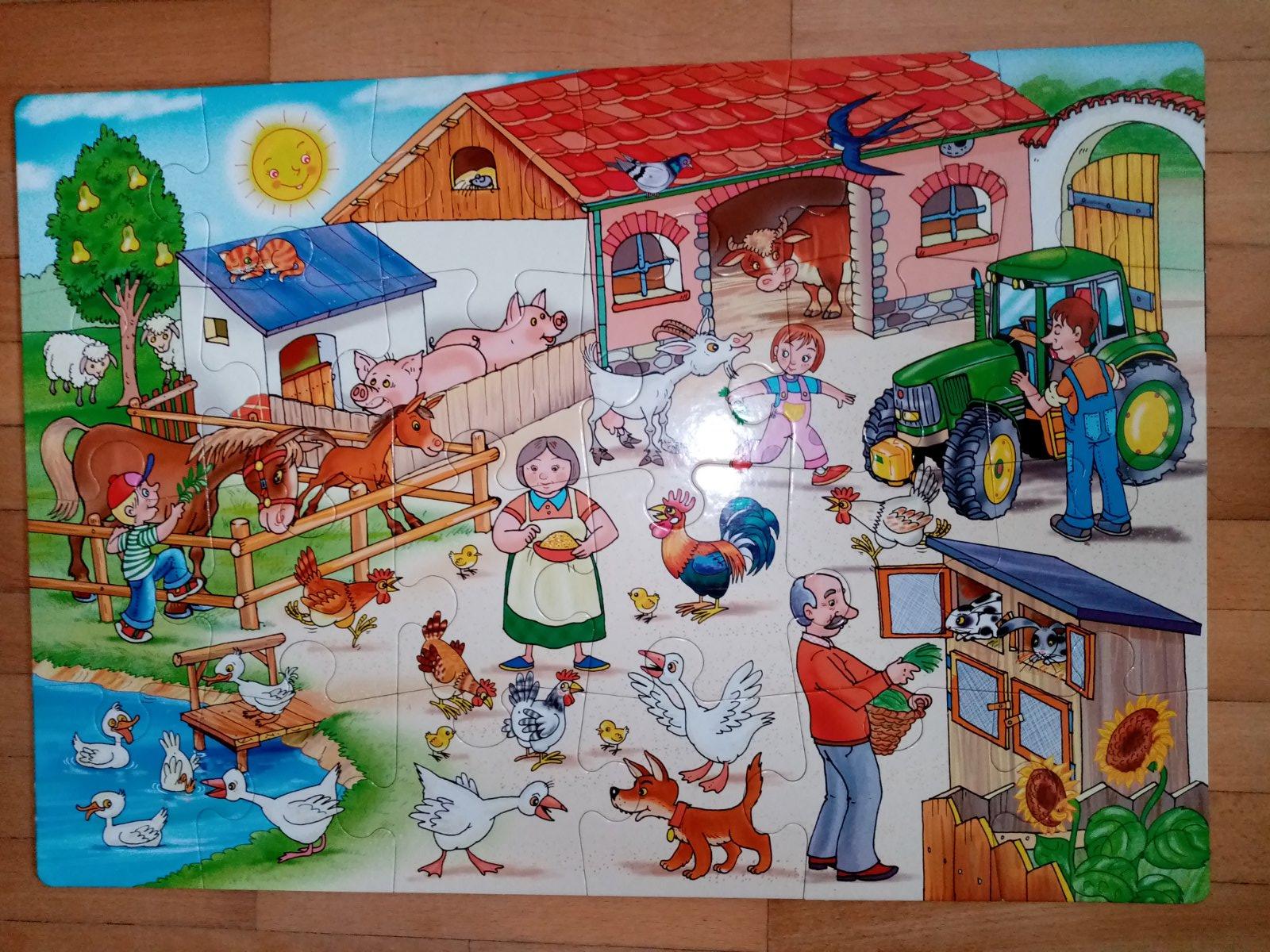 Veľké dieliky puzzle, vhodné na skladanie na zemi. Dá sa poskladať farebný obrázok alebo čiernobiely na vymaľovanie, Rozmer 675x470mm, 24 kusov. Používané, pekný stav, pár minimálnych chybičiek, viď foto.