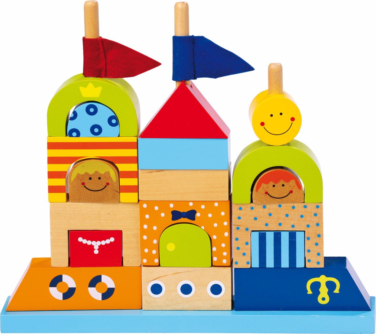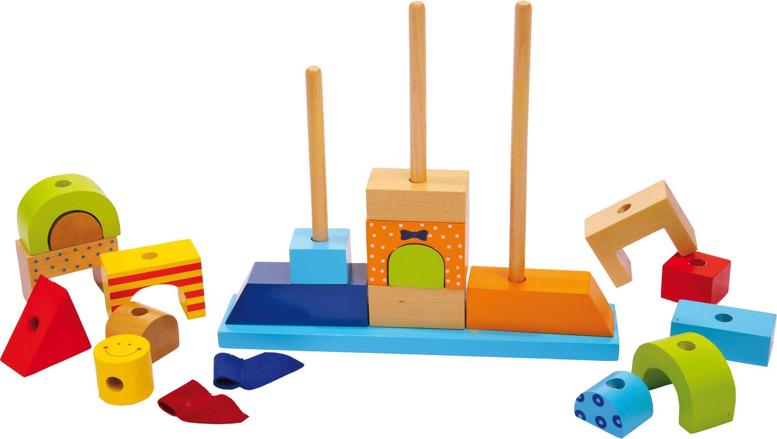 Farebne a transparentne lakované, drevené, stavebné kocky v rôznych tvaroch sa nasadzujú na tri tyče. Tu sa deti môžu naučiť rozpoznávať rôzne tvary a zlepšiť si manuálnu zručnosť.