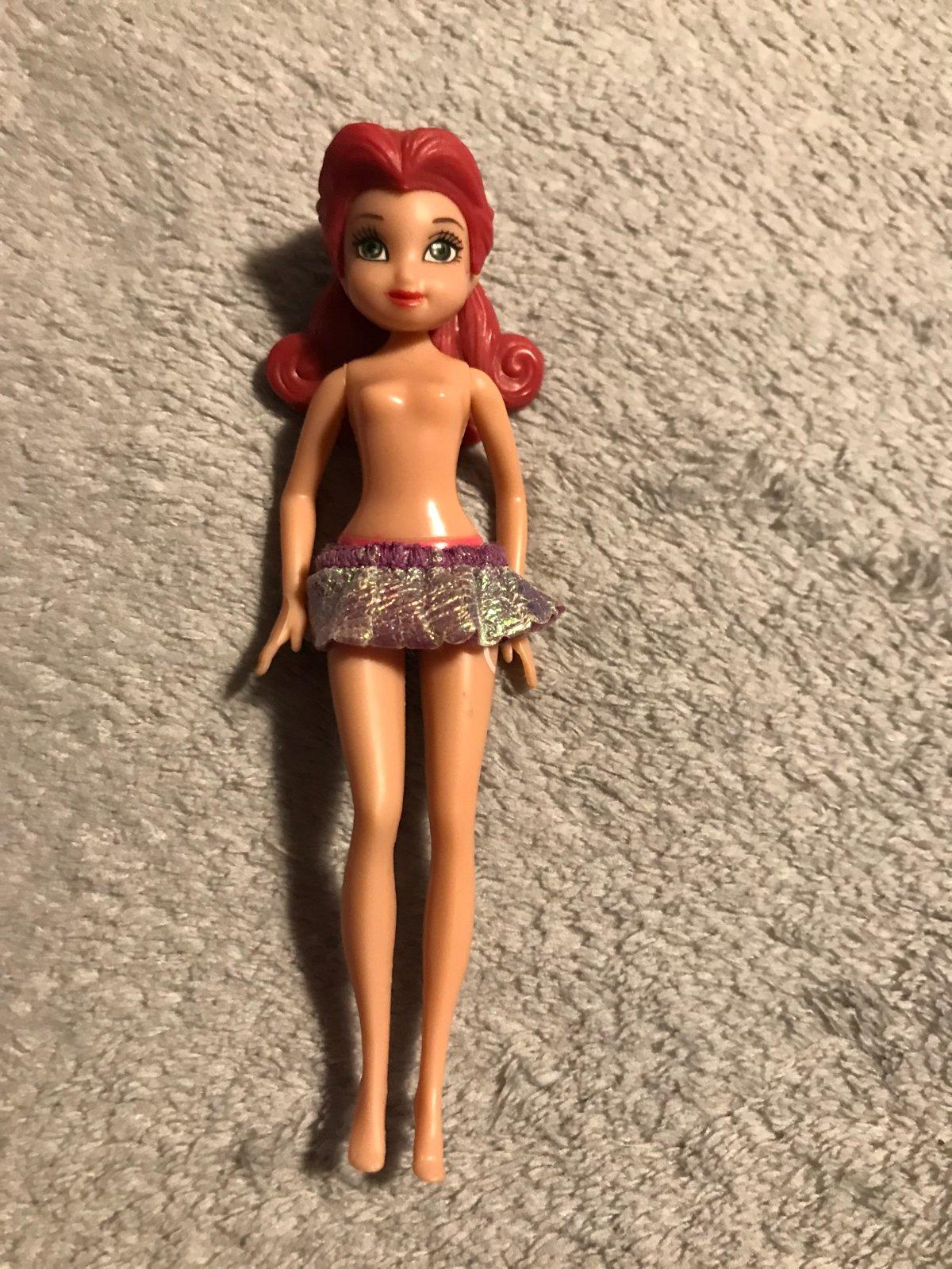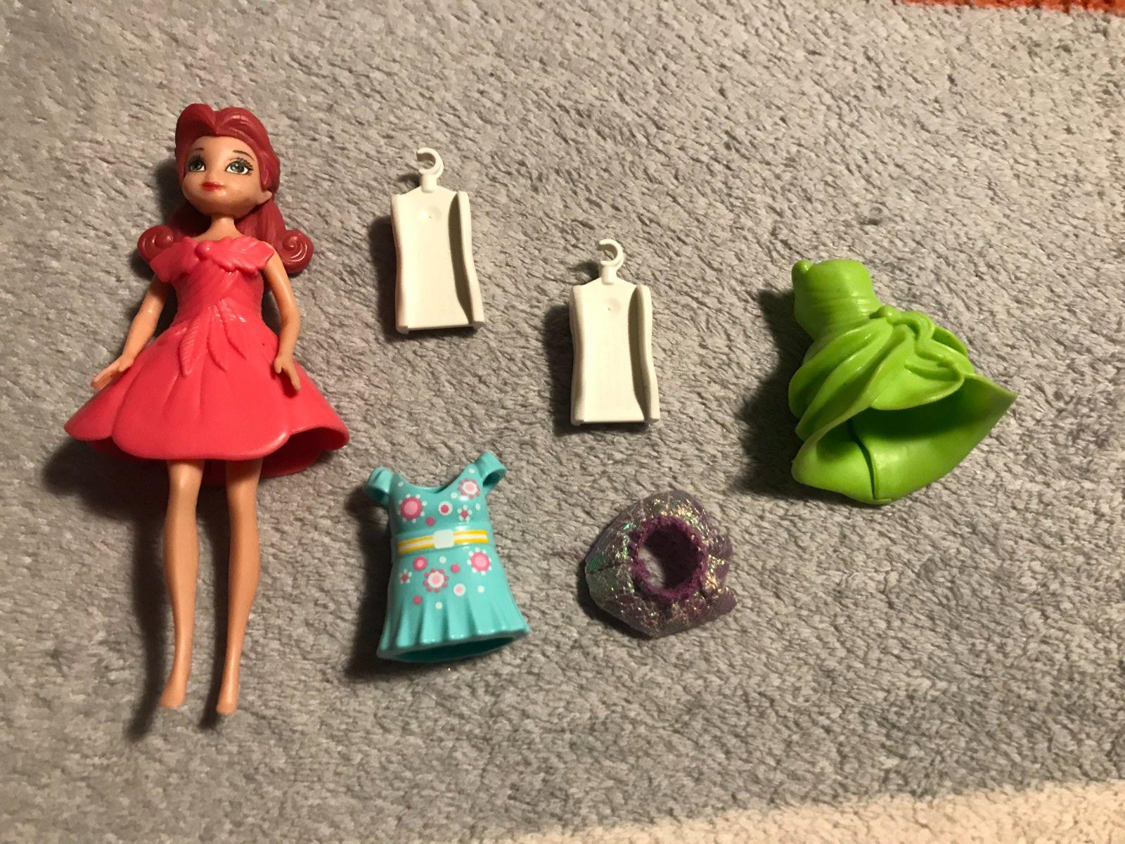 Predam malu babiku v dobrom stave s gumenymi šatami, ktore sa vzadu zapinaju + 1ks gumene saty + 1 ks plastove saty + 2 ks male vesiaciky + mala suknicka.