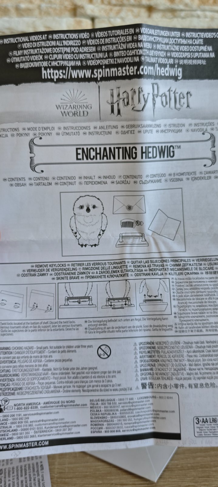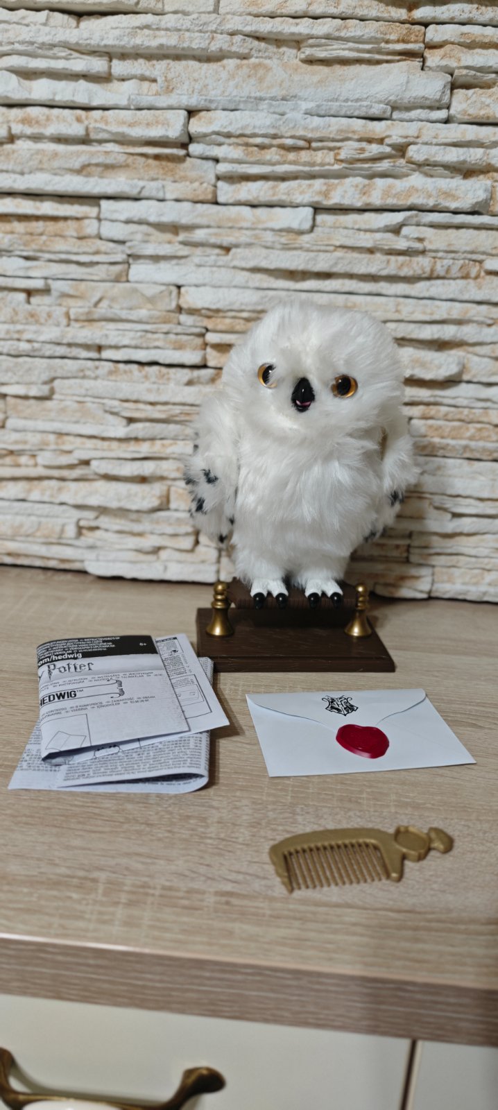 Predám v podstate novú (len vybalenú) interaktívnu sovu Hedwigu, ktorá je skvelou voľbou pre všetkých fanúšikov Harryho Pottera (pre všetky deti a možno poteší aj dospelých zberateľov Herryho Pottera). Dokáže predviesť viac ako 15 realistických zvukov a pohybov, necháva sa hladiť či česať a na maznanie tiež na oplátku reaguje. Konverzáciu podporuje húkaním aj ďalšími zvukmi. Vie udržať správu v obálke, ktorú vydá po trojnásobnom pohladení po hlave.Sovu môžete vybrať z bydielka, česať ju alebo si ju nechať obhrýzať prst. Reaguje na dotyk. Hedwiga sa rada mazná. Dokáže vycítiť, akým spôsobom ju hladkáte, a keď je spokojná, tíško cvrliká. Naopak sa jej nepáči, keď ju hladkáte proti smeru pierok, a svojimi zvukmi to dá najavo. Rozpozná tón hlasu So sovičkou sa môžete aj rozprávať. Keď budete rozprávať potichu, zahúka, že vás počuje, ale opätuje tiež hlasnejšie zvuky.