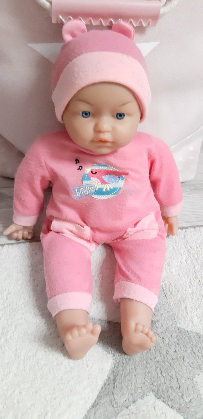 Bábika s mäkkým bruškom, po stlačeni bruška vydáva zvuky. Dobry pouzivany stav.