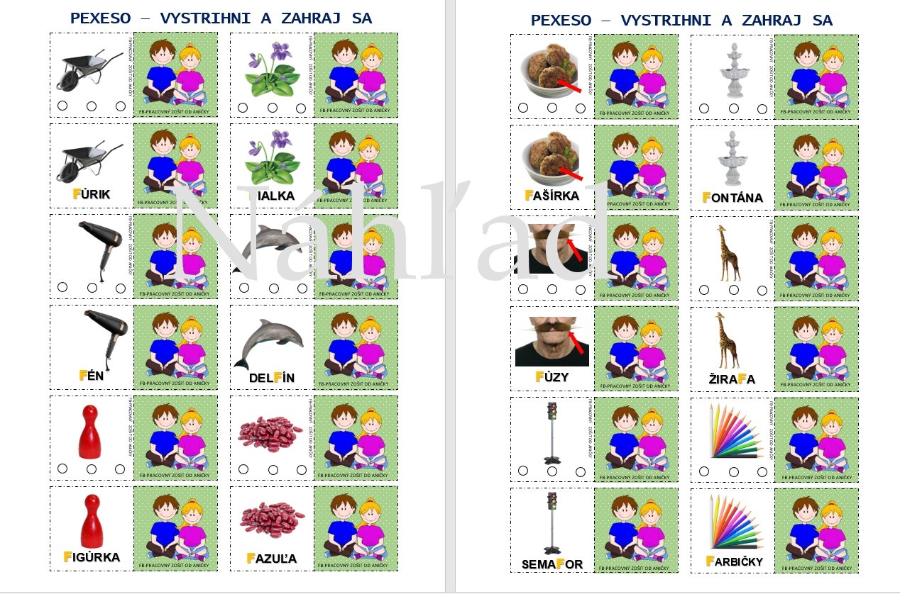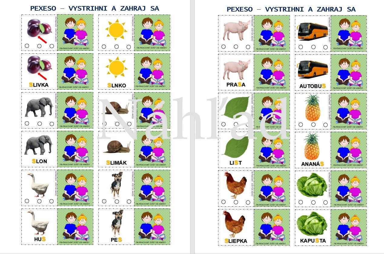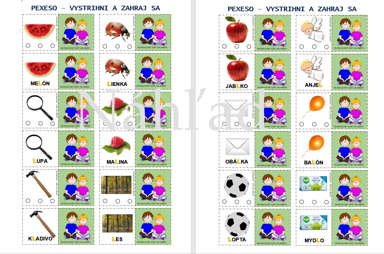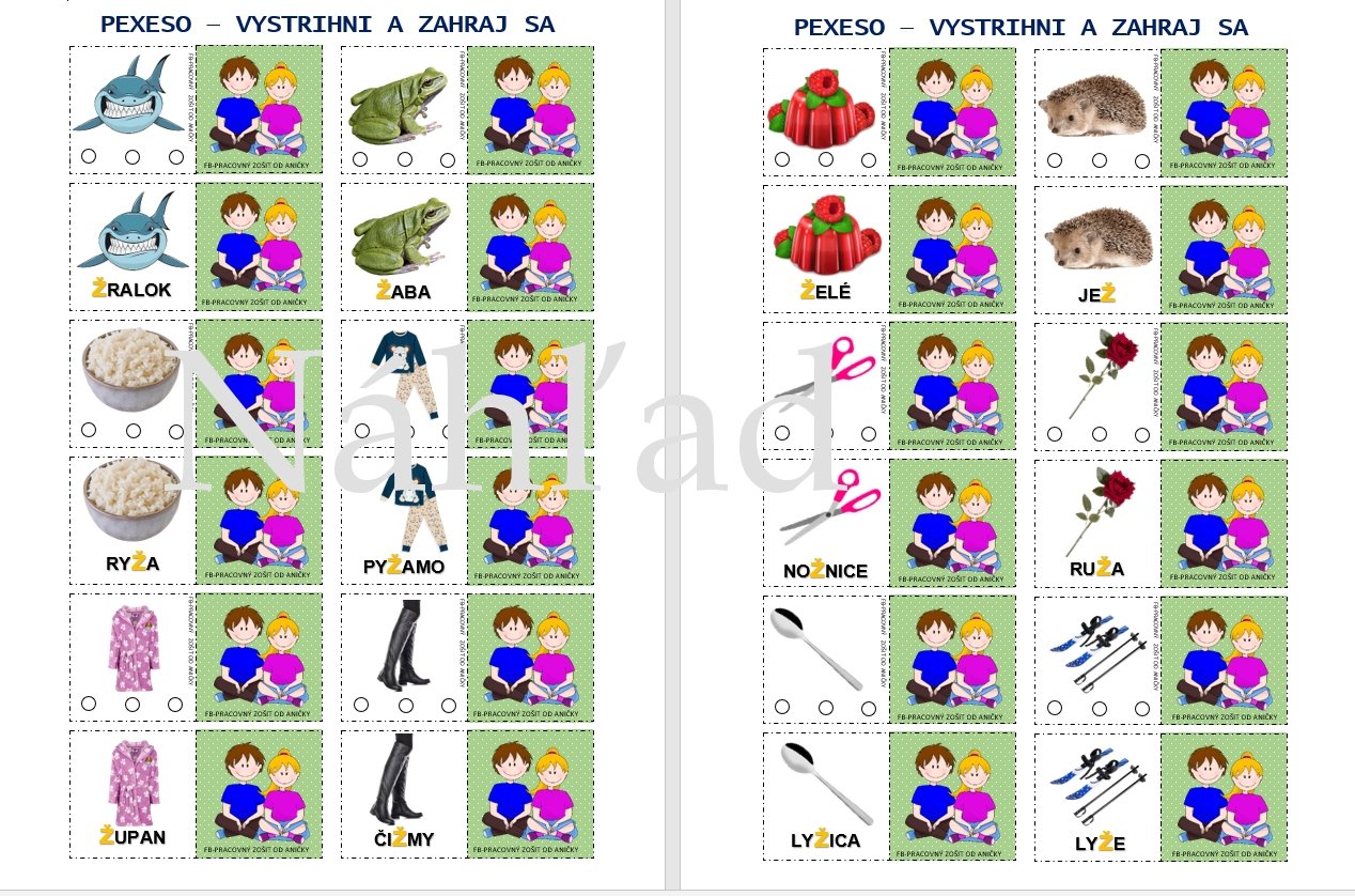 Pár tvorí obrázok s pomenovaním (kde je zvýraznená problematická hláska) a obrázok s tromi krúžkami. Problematická hláska pomenovania daného predmetu je oranžovej farby.