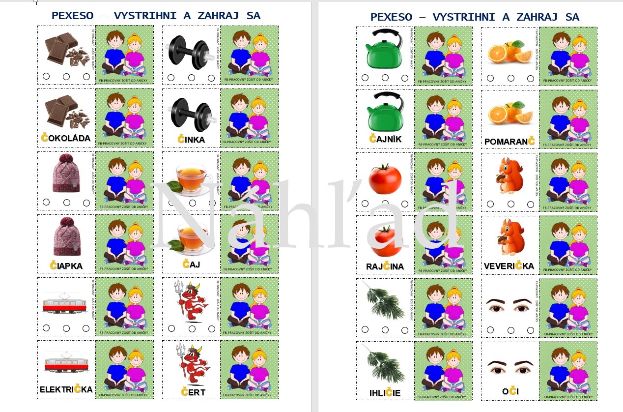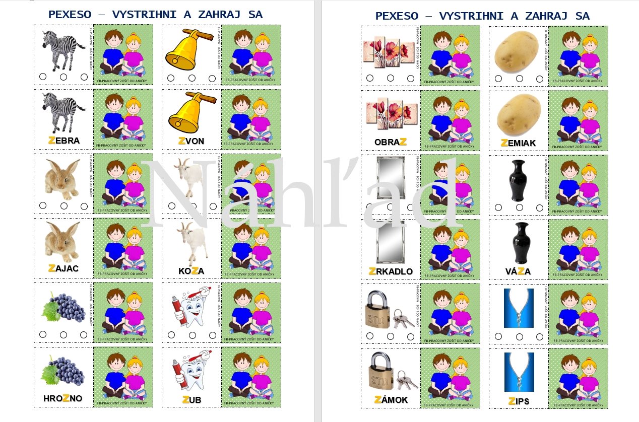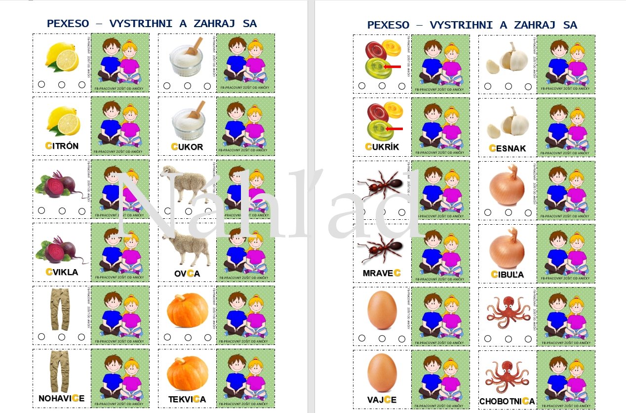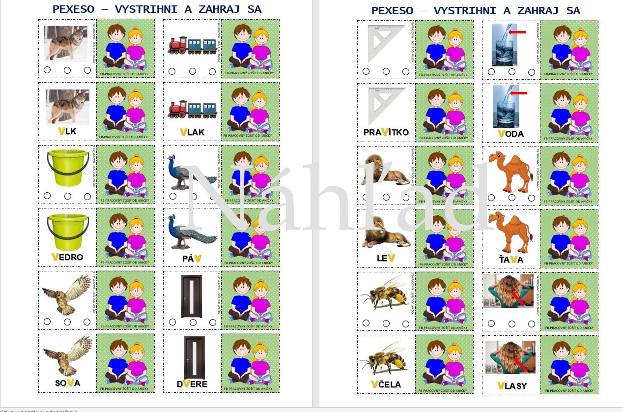 Pár tvorí obrázok s pomenovaním (kde je zvýraznená problematická hláska) a obrázok s tromi krúžkami. Problematická hláska pomenovania daného predmetu je oranžovej farby.