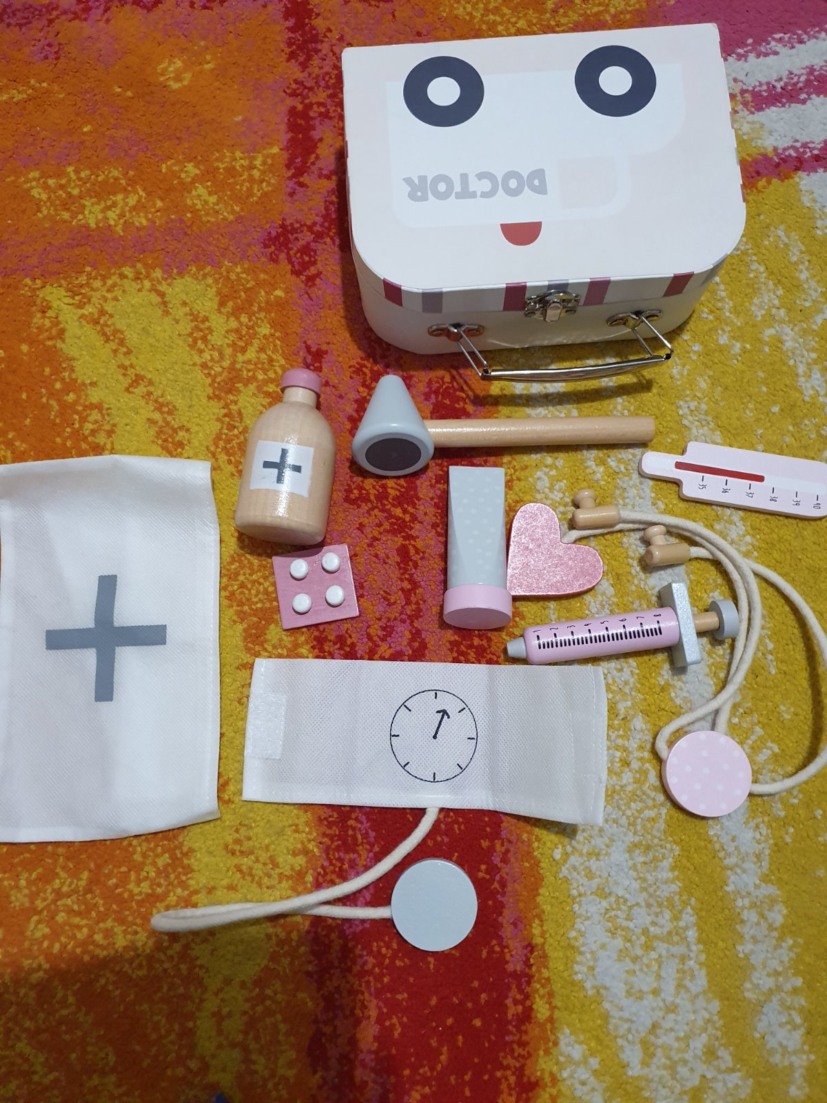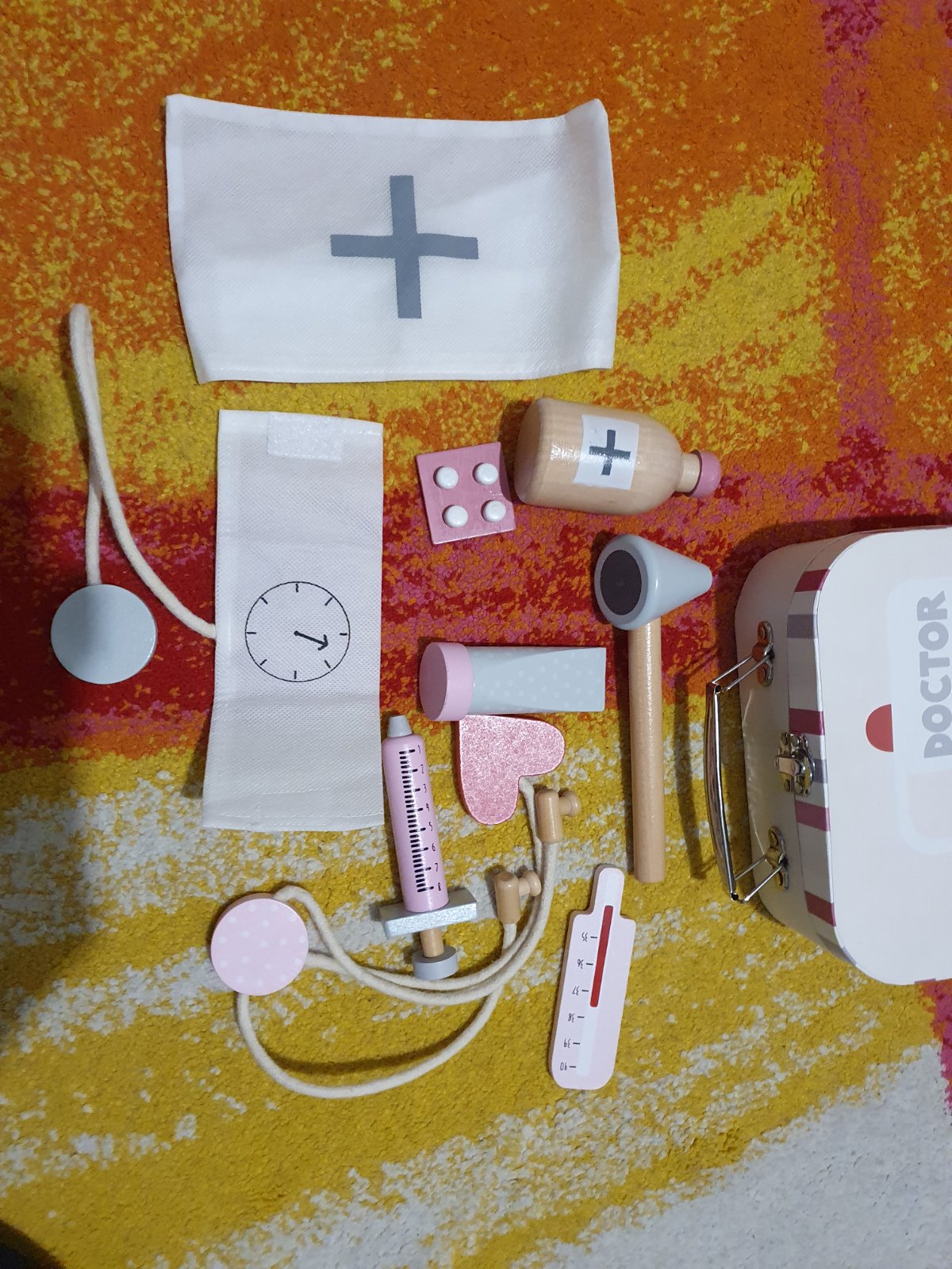 Lekársky kufrík s drevenými pomôckami. Mierne opotrebenie.