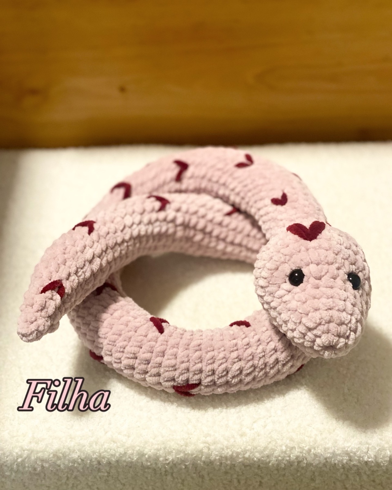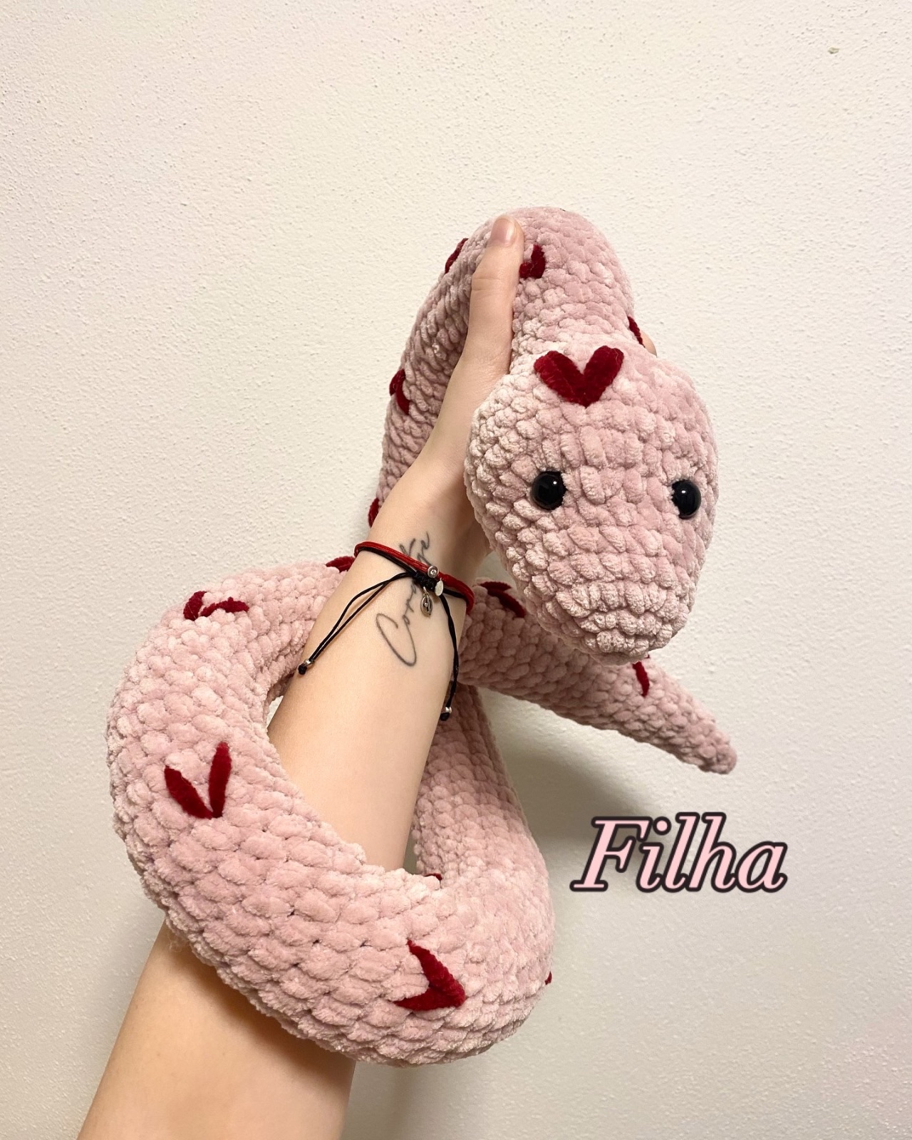 Háčkovaný had 🐍 v ružovom prevedení. 🩷Vyrobený je z mäkkej, hrubej vlny príjemnej na dotyk. Má bezpečnostné oči a vyplnený je antialergickým dutým vláknom. Tento konkrétny kus má 113 centimetrov.