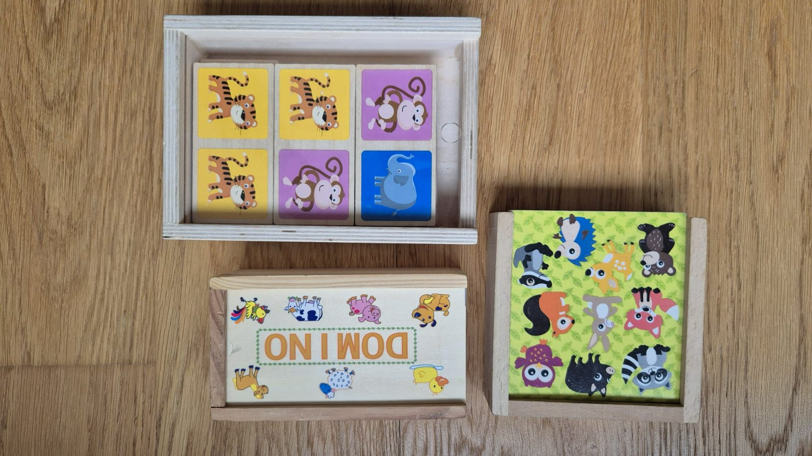Drevene domina se zviratkami. Vsechny spolu za 9€, nebo 3€ jedno. U zeleneho myslim, ze chybi nejaky dilek. Cena + posta