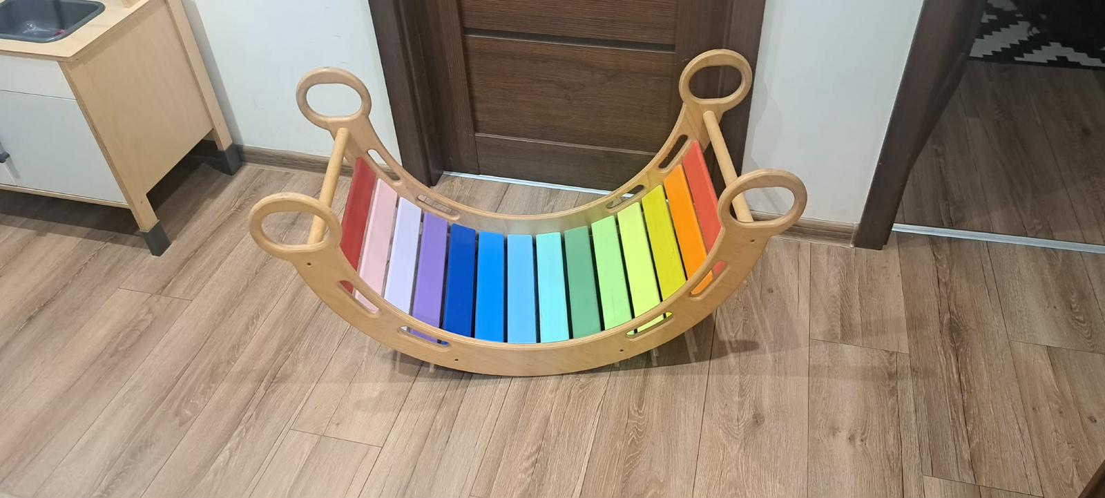 Drevená montessori kolíska pre deti, dá sa použiť ako kolíska, preliezka alebo aj pult na hranie. Bežné známky používania.