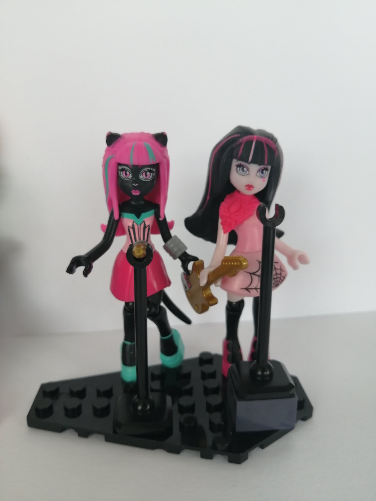 Predáva sa v stave ako je na fotke. Chýbajú niektoré doplnky (napr náramky), jeden štvorcový dielik je vymenený za iný, jeden podstavec pod stojan na mikrofón chýba, aj jeden mikrofón. Chýbajú 2 samostatné podstavce a zlatá gitara má ulomený úchop, ale vedia ju postavičky aj tak držať. Vôbec tieto diely v sade nechýbajú. Stavebnica typu lego, je plne kompatibilné s legom, akurát postavičky sú väčšie ako legové. Návod nemáme.