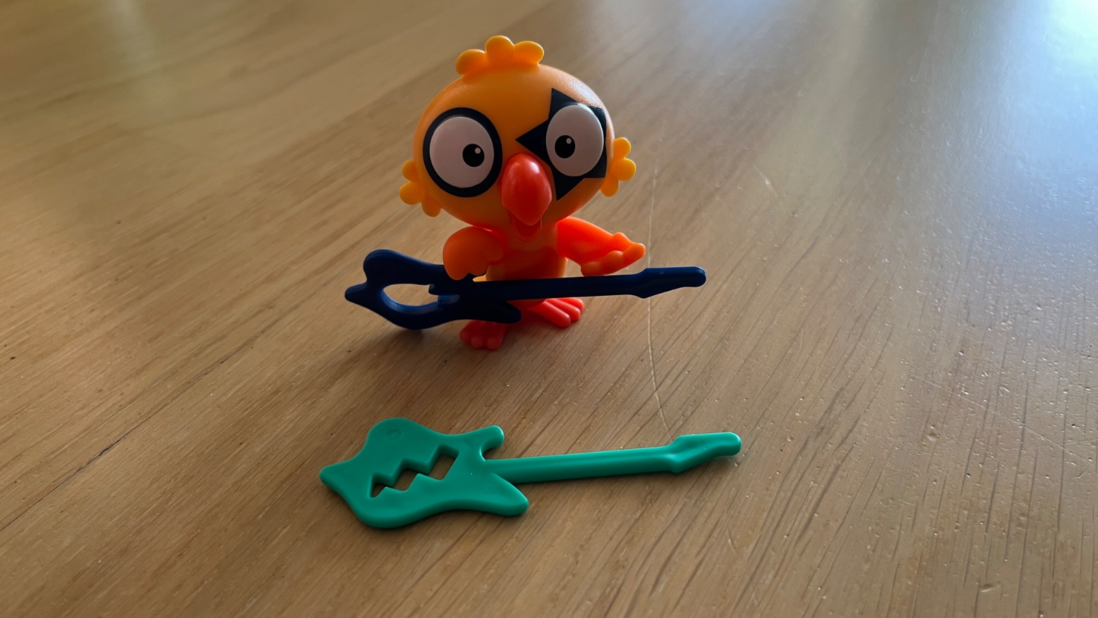 Vtipná postavička s gitarou (modrú si vie vymeniť za zelenú).