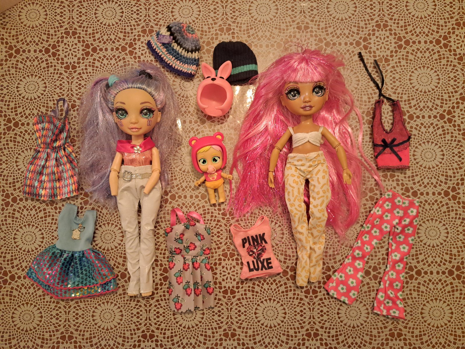 1 veľká Lolka kompletná. Druhej chýbajú ručičky. Dieťa mini toys ako Baby šéf. Veľa náhradného oblečenia. Cena za celý set