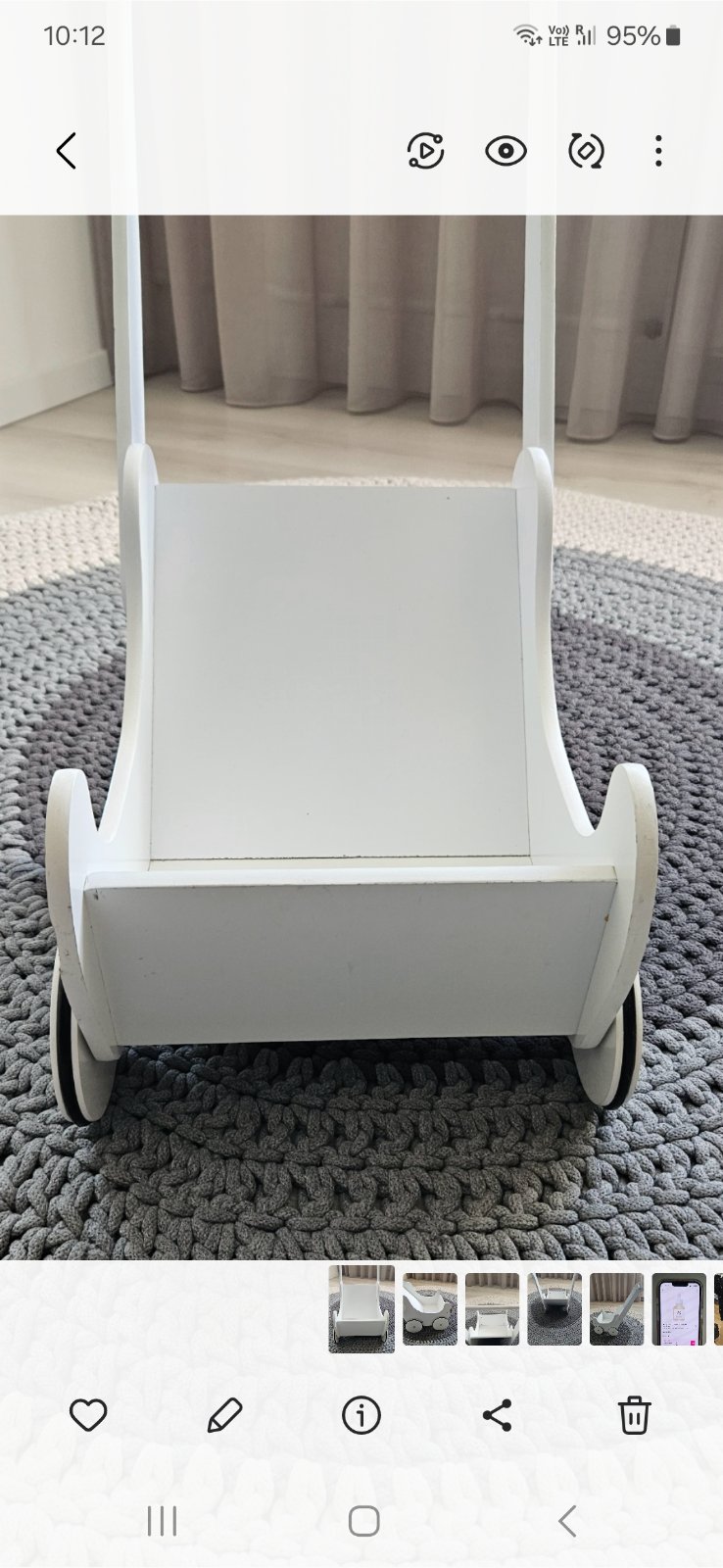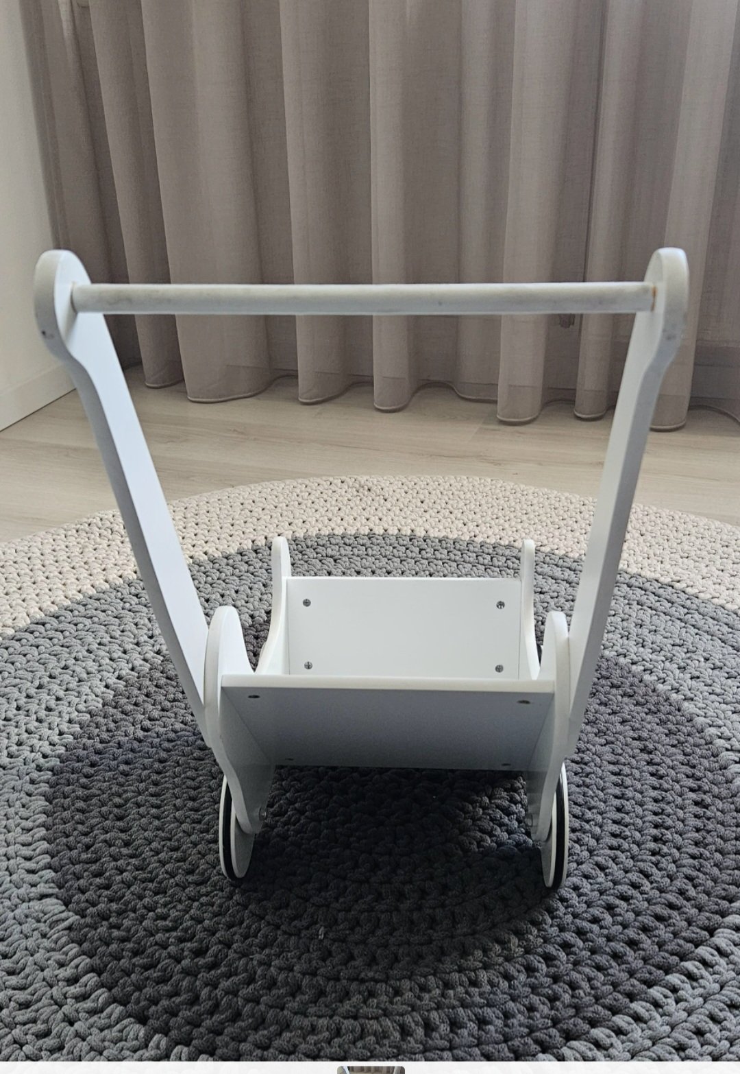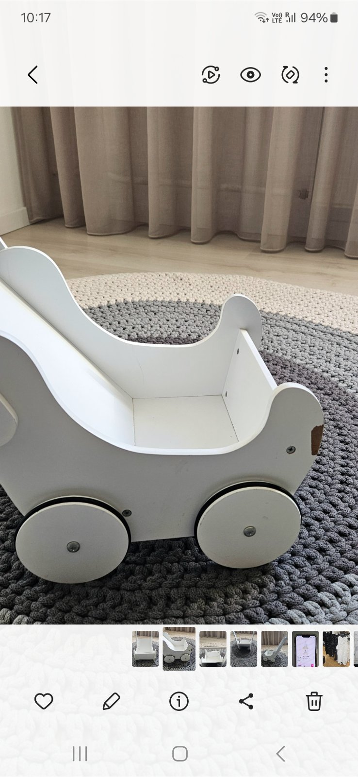 Krasny dreveny kocik . Poskodenia som nafotila. Jeden par koliesok trocha vrzga,treba asi rozobrat , nakolko u nas to bolo hned od zaciatku, len sme to neriesili.