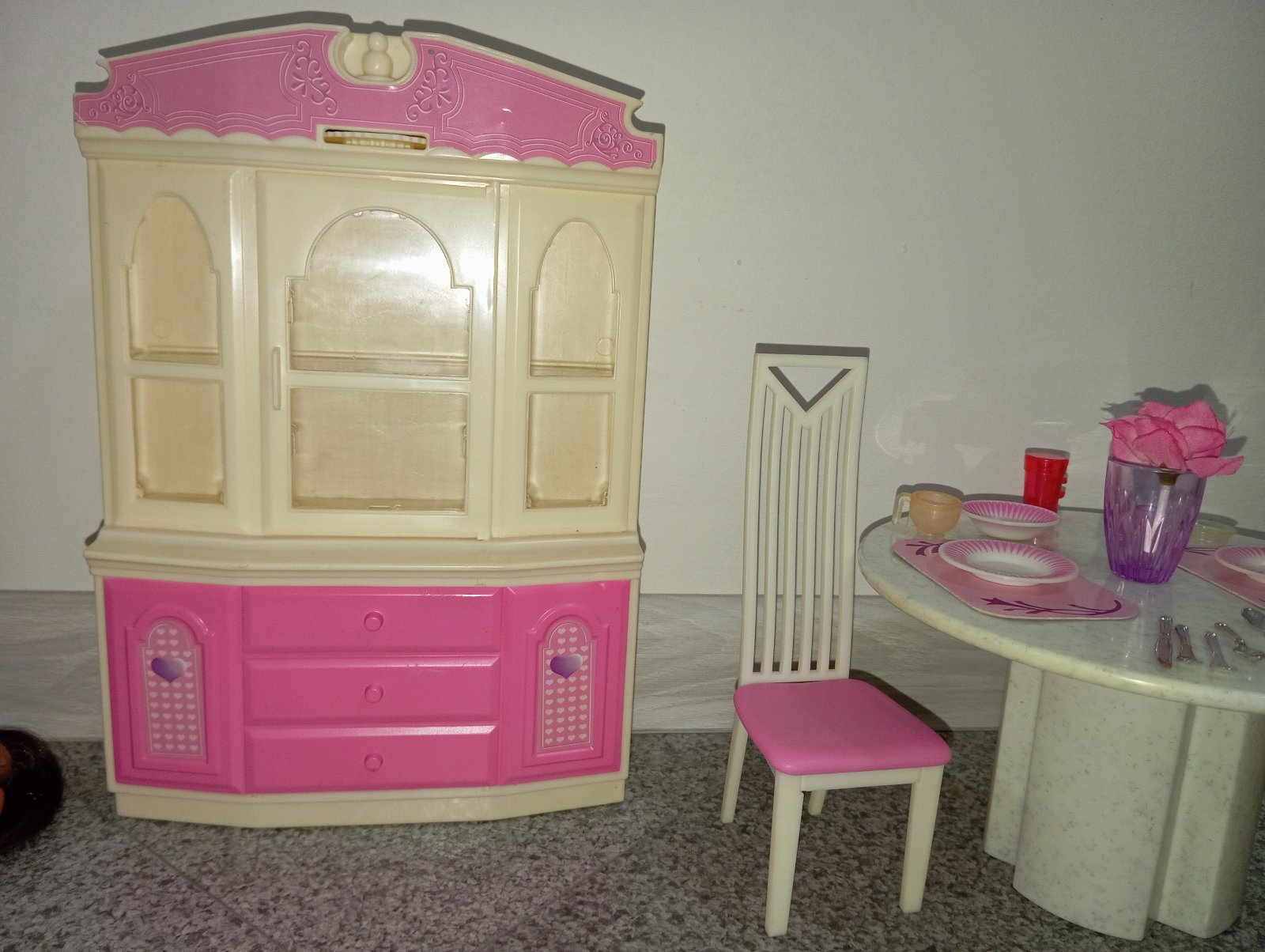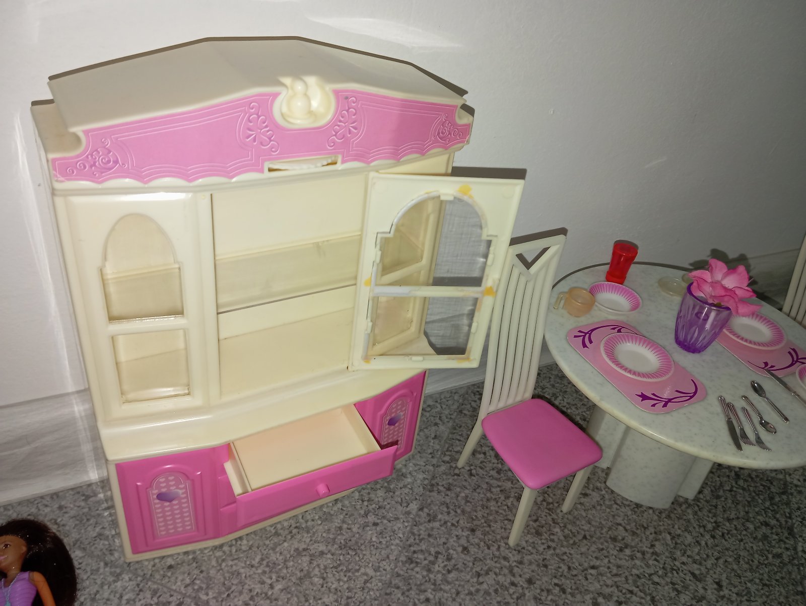 Kredenc, stôl, dve stoličky a drobné kuchynské riady pre barbie, steffi, my scene a podobné bábiky.