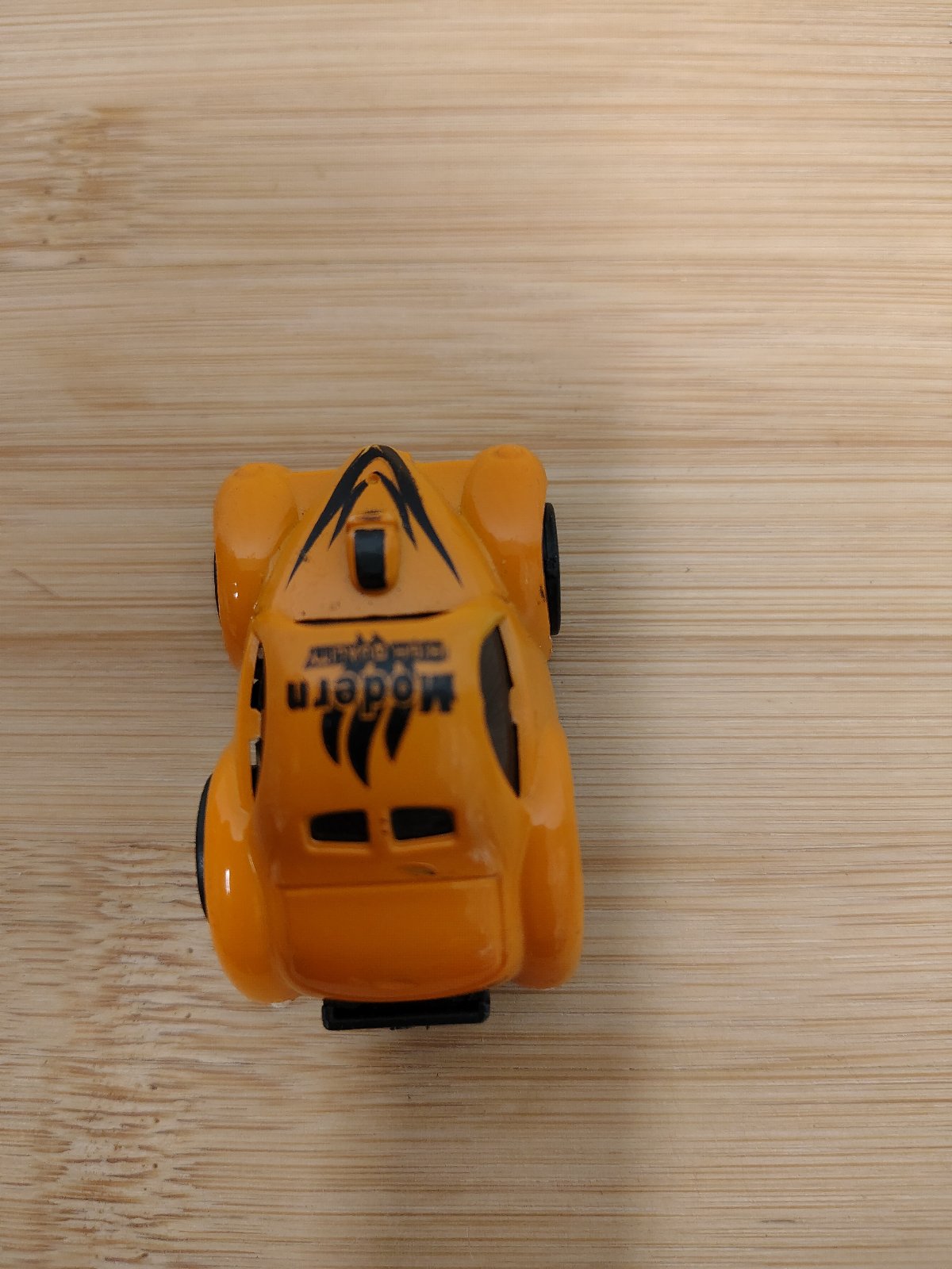 Mini autíčko so zotrvačníkom, oranžový Chrobák, ide o malé plastové autíčko oranžovej farby s nápisom "Modern" na streche. Dizajnovo pripomína model Volkswagen Beetle (Chrobák) v športovej verzii, má funkčný zotrvačník (pull-back motor), po natiahnutí dozadu samé jazdí. Vhodné ako drobnosť pre deti, do adventného kalendára alebo ako náhradné autíčko k prenosným autodráham.