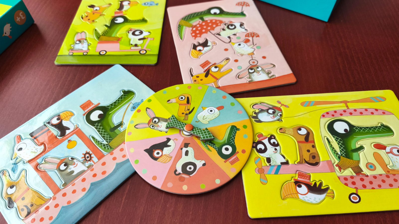 Krásne farebné puzzle po 6 tvarovaných zvieratiek na 4 kartách. Kvalitné prevedenie.