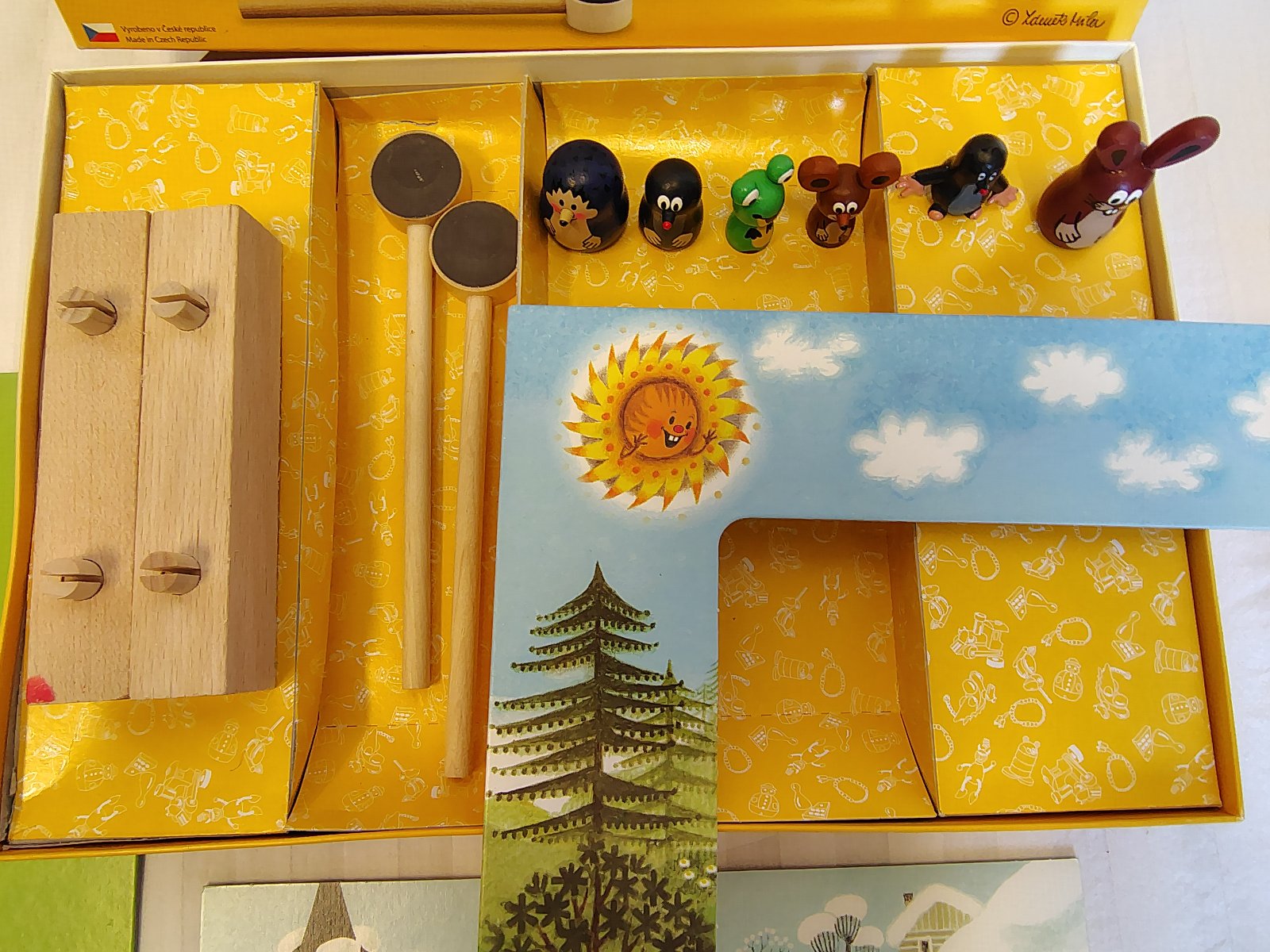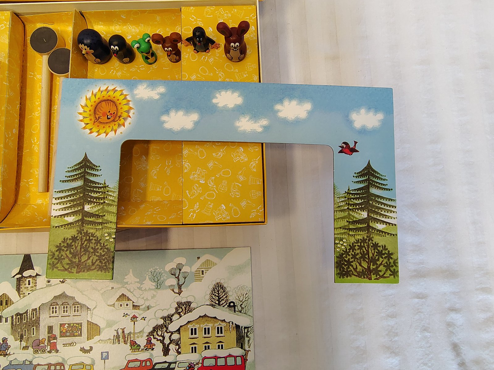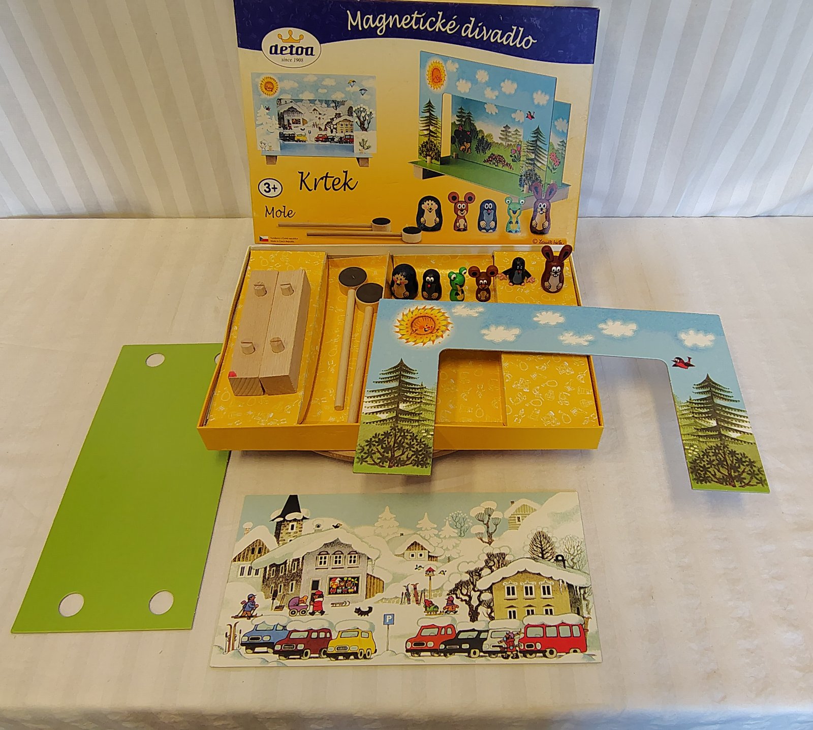 Kompletné príslušenstvo: Javisko, 2 obojstranné kulisy (leto/zima) a 2 originálne magnetické tyčky na ovládanie.