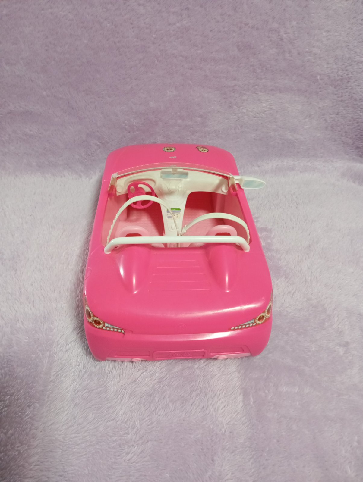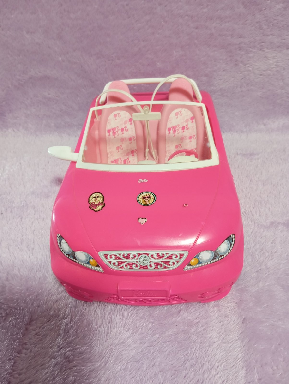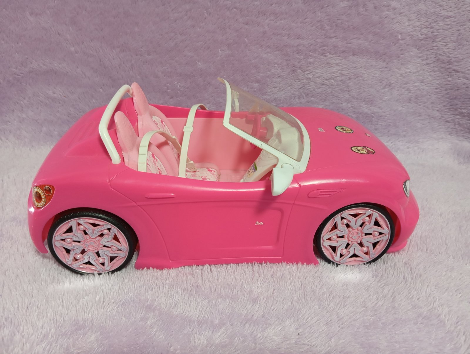 Pekné Barbie auto pre dve bábiky, s bezpečnostnými pásmi. Chýba jedno zrkadlo.