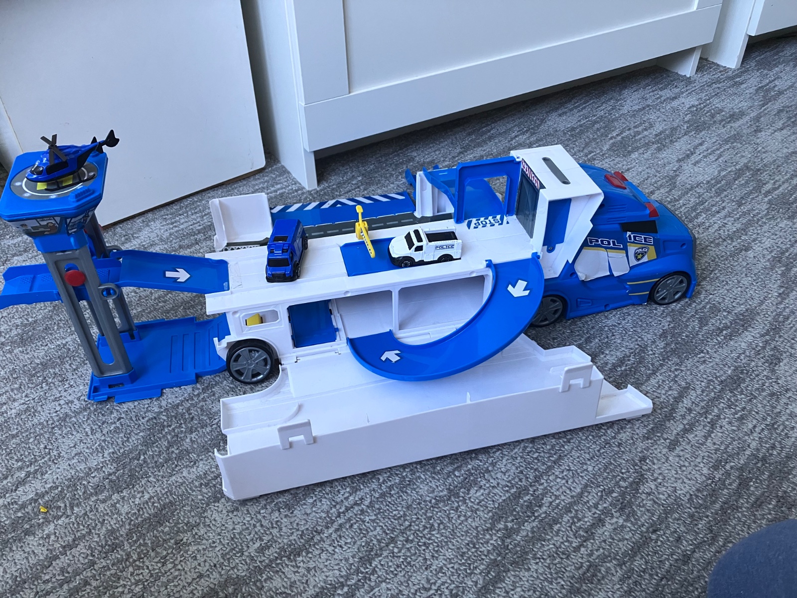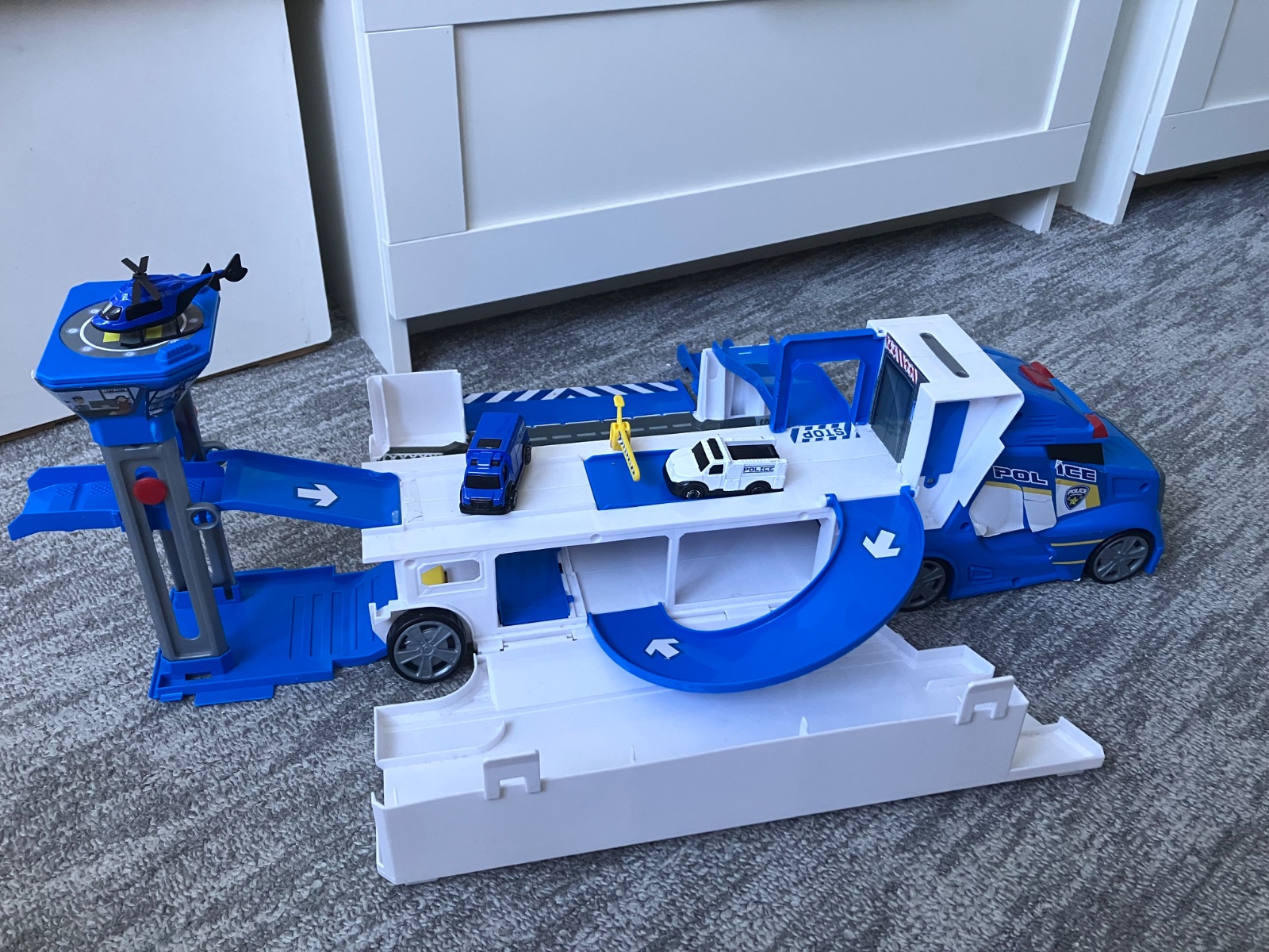 Rozkladacie policajné auto / kamión. Zvuky a svetlá po stlačení tlačidla. Vrátane dvoch autíčok a vrtulníka. Všetko sa skladá do vnútra kamiónu.