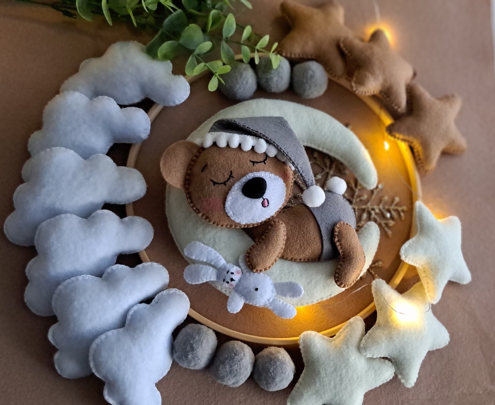 Ručne šitý kolotoč. Farby na zelanie,aj motiv. Priemer kruhu 26cm. Stojan vyska 66cm. Hracia skrinka hra 36 melodii.