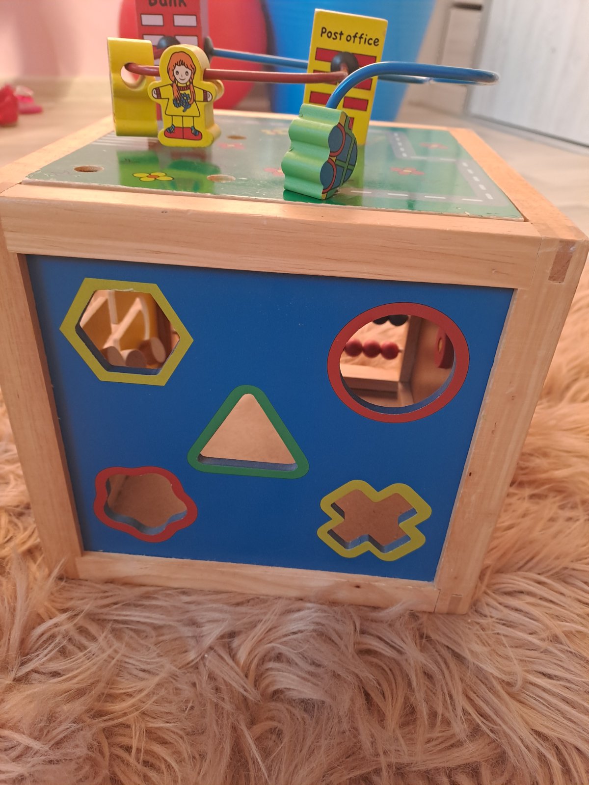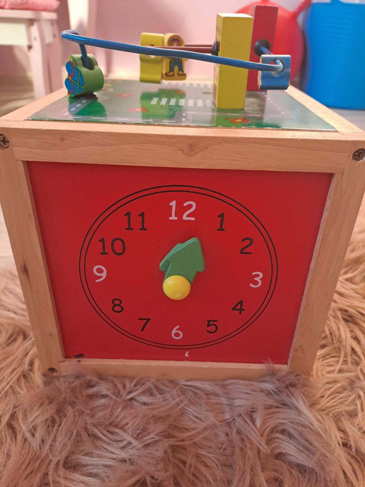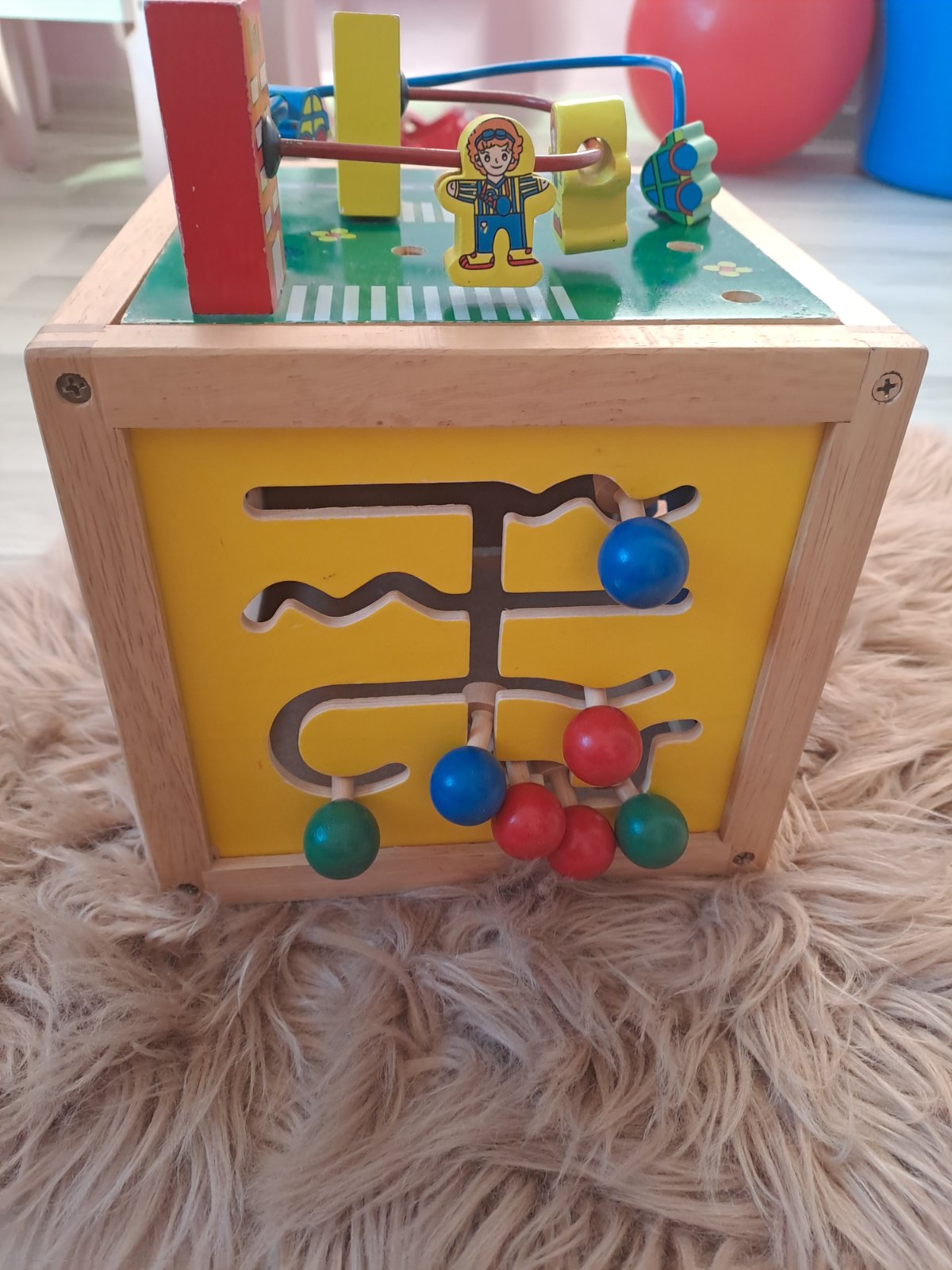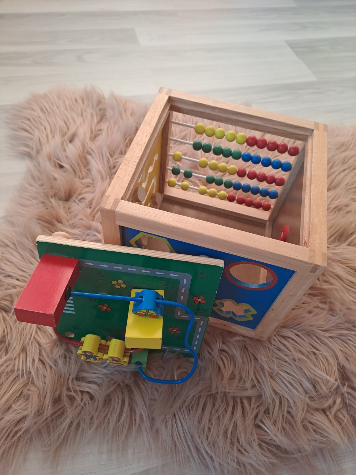 Drevená veľká kocka, plná množstva interaktívnych aktivít. Naviac počítadlo a hodiny. Pekný hraný stav, bez výraznych poškodení. Rozmery 21.5cmx20cm.