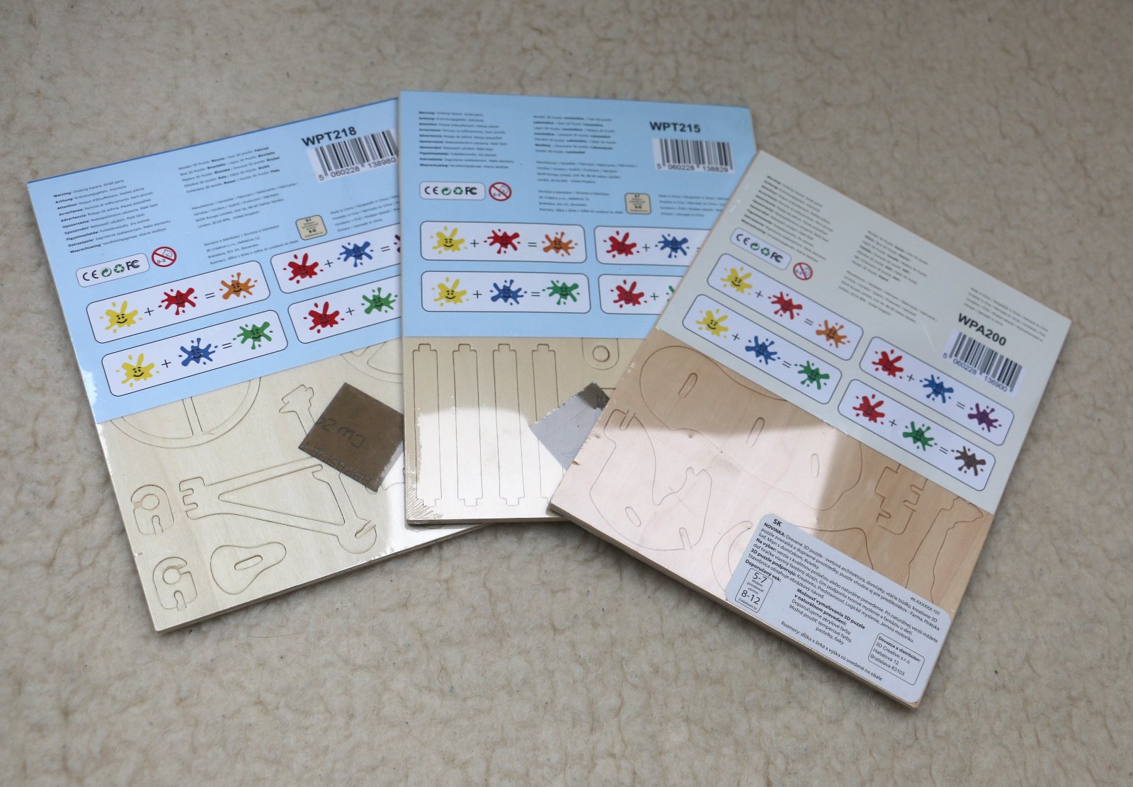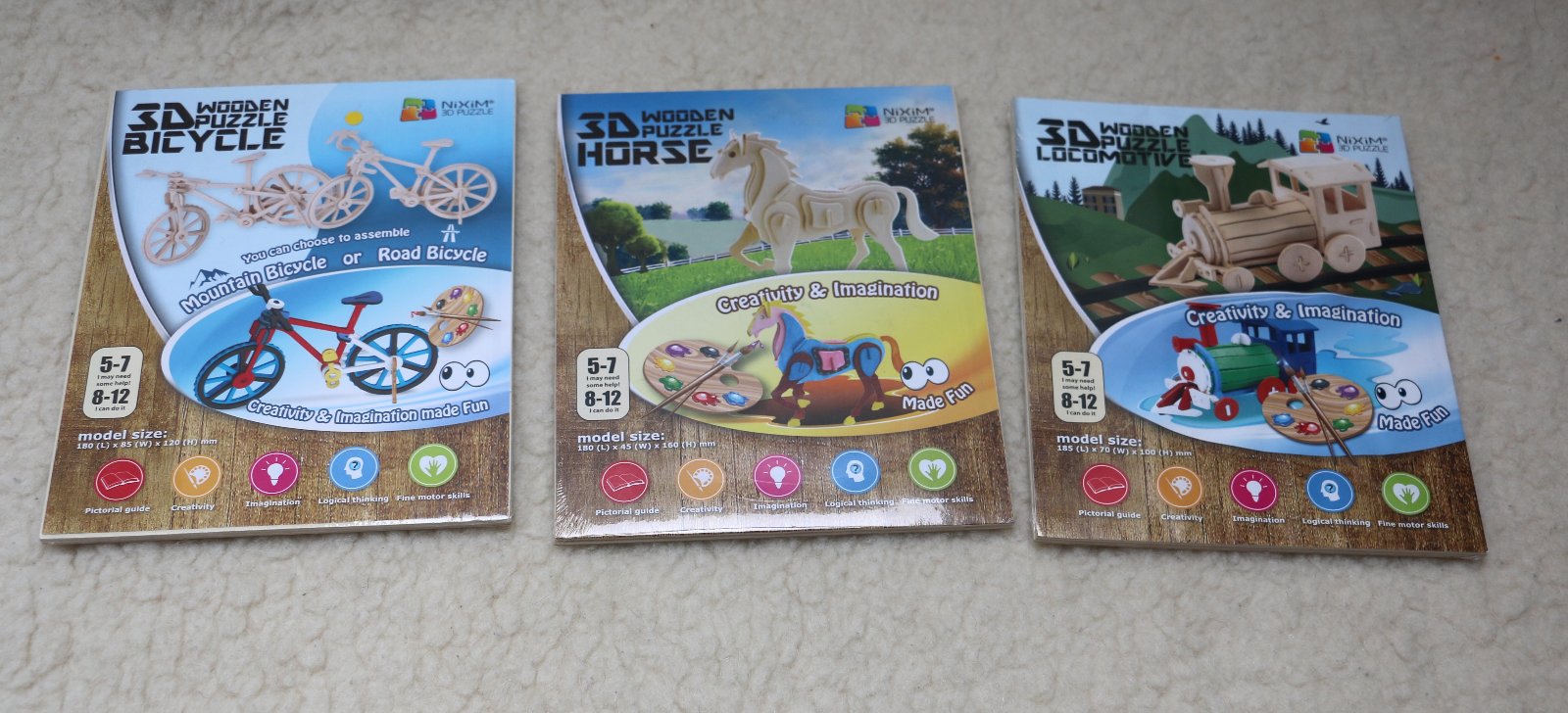Drevené priestorové puzzle – lev, rušeň, bicykel. Od 5 rokov s dopomocou dospelých. Cena za všetky 3 spolu uvedená aj s poštovným.