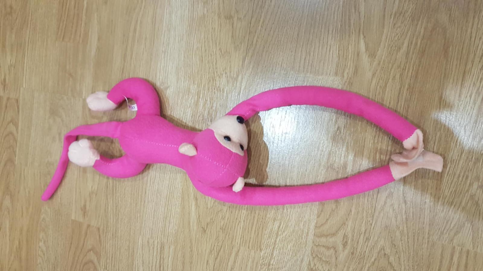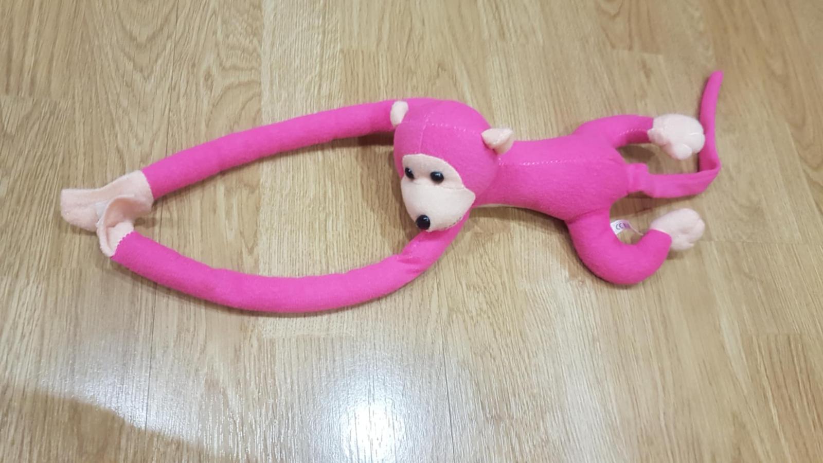ružová opica, ruky sa spájajú suchým zipsom. Celková dĺžka aj s chvostom je 65 cm. Má spevnené bruško.
