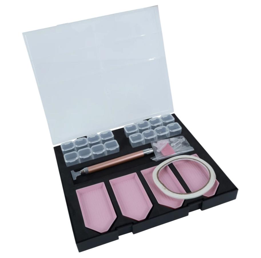 Tento úložný box navrhnutý špeciálne pre diamantové maľovanie nebol nikdy ponúkaný tak kompletný. Vďaka úložným boxom, trepacím miskám a potrebnému príslušenstvu si môžete byť istí, že vám nebude chýbať nič, čo sa týka pohodlia.