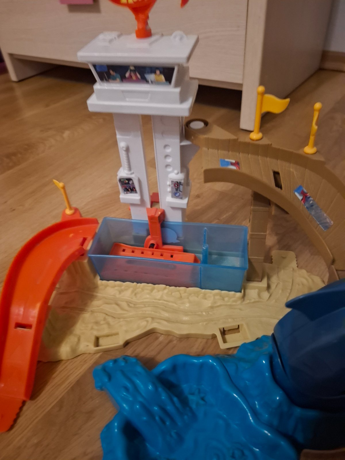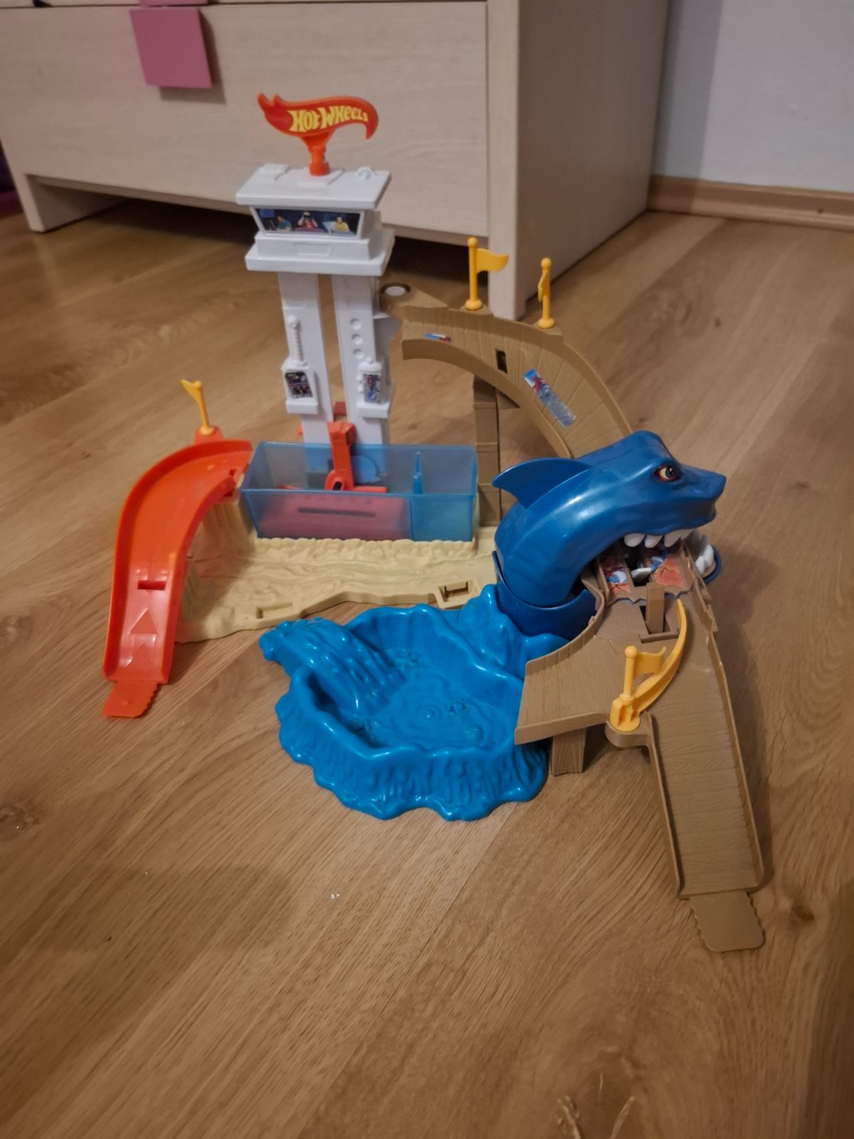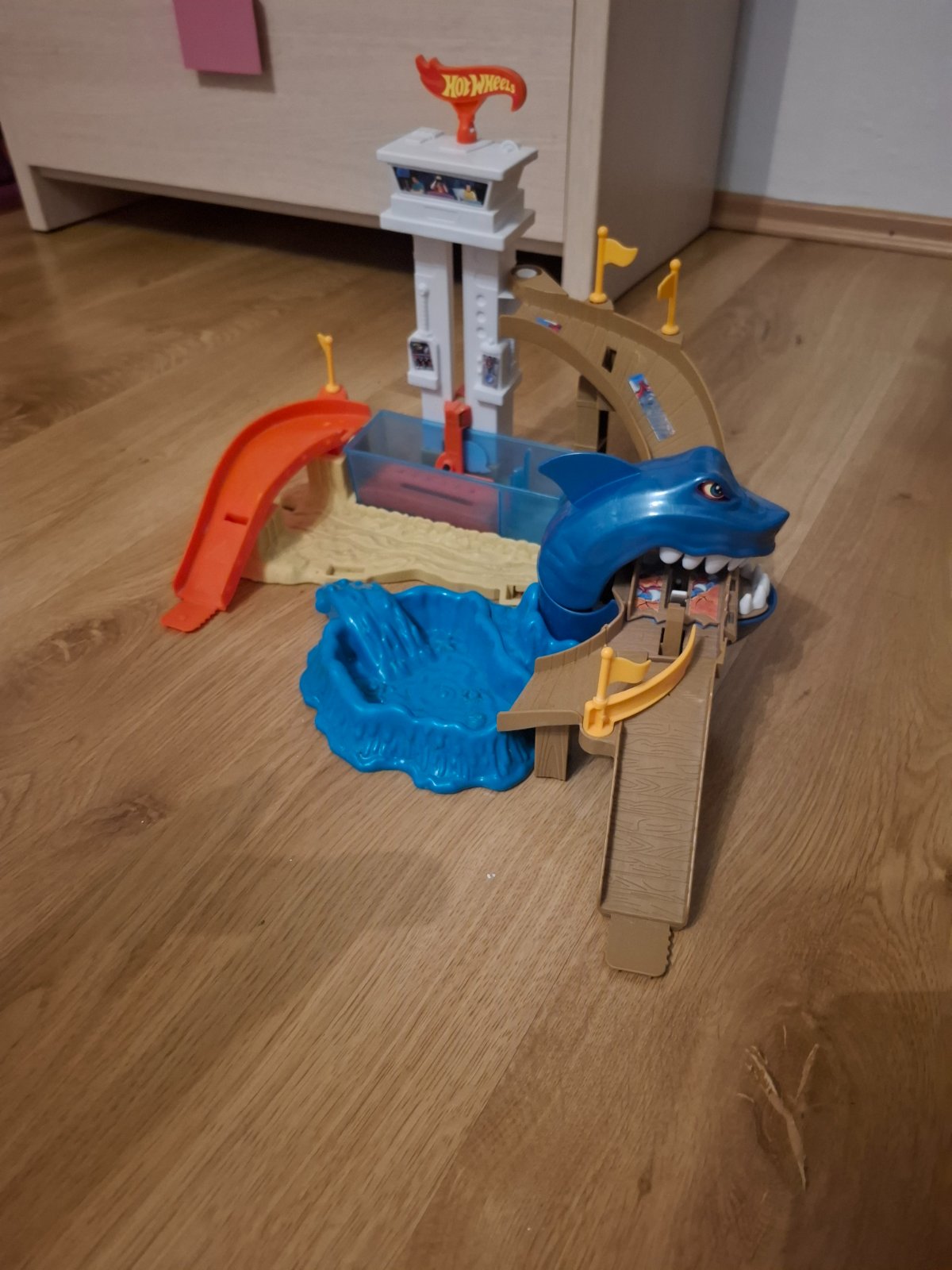 Dokážeš utiecť žralokovi? Zistíš to s týmto úžasným akčným hracím setom pre zmenu farby. Schádzajte z veže dole po rampe, ale pozor na žraloka - je hladný a dal by si nejaký kovový stroj, takže je pripravený chytiť tvoje auto do zubatej papule! Keď ťa chytí, pošli ďalšie auto dole po rampe a traf sa do páky a uvoľni ju, aby sa chytené auto dostalo do bezpečia.