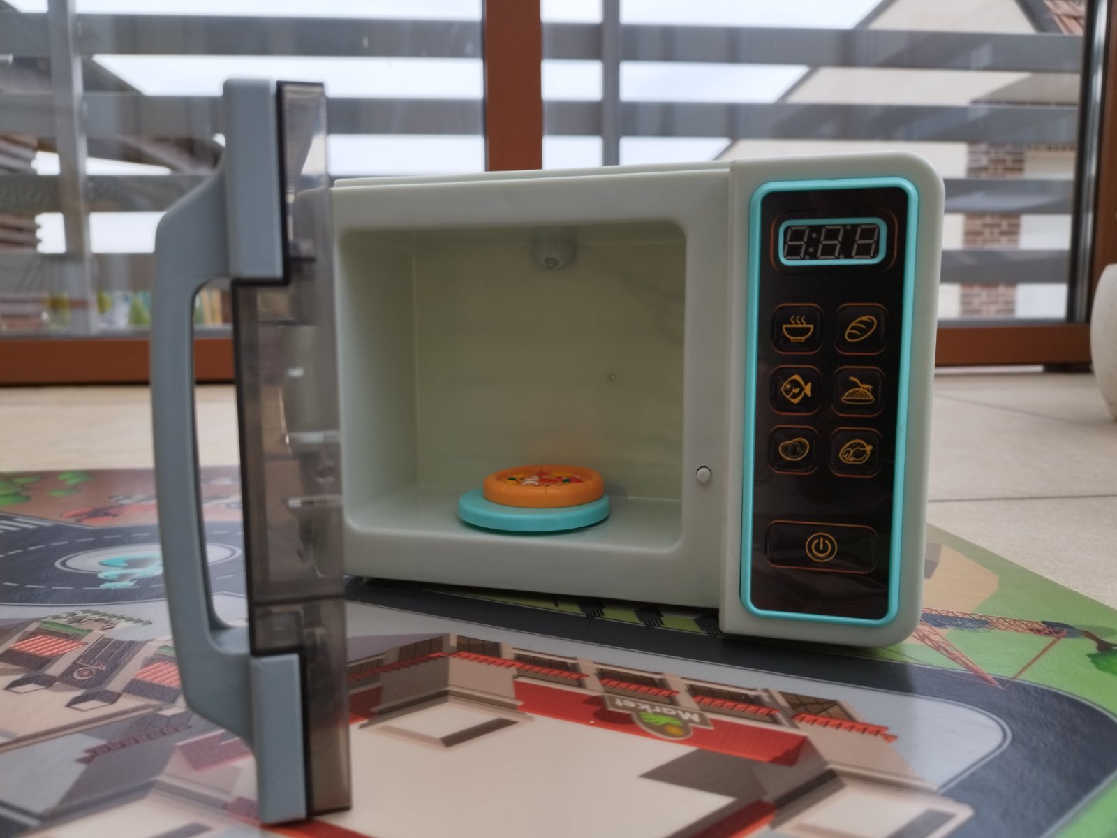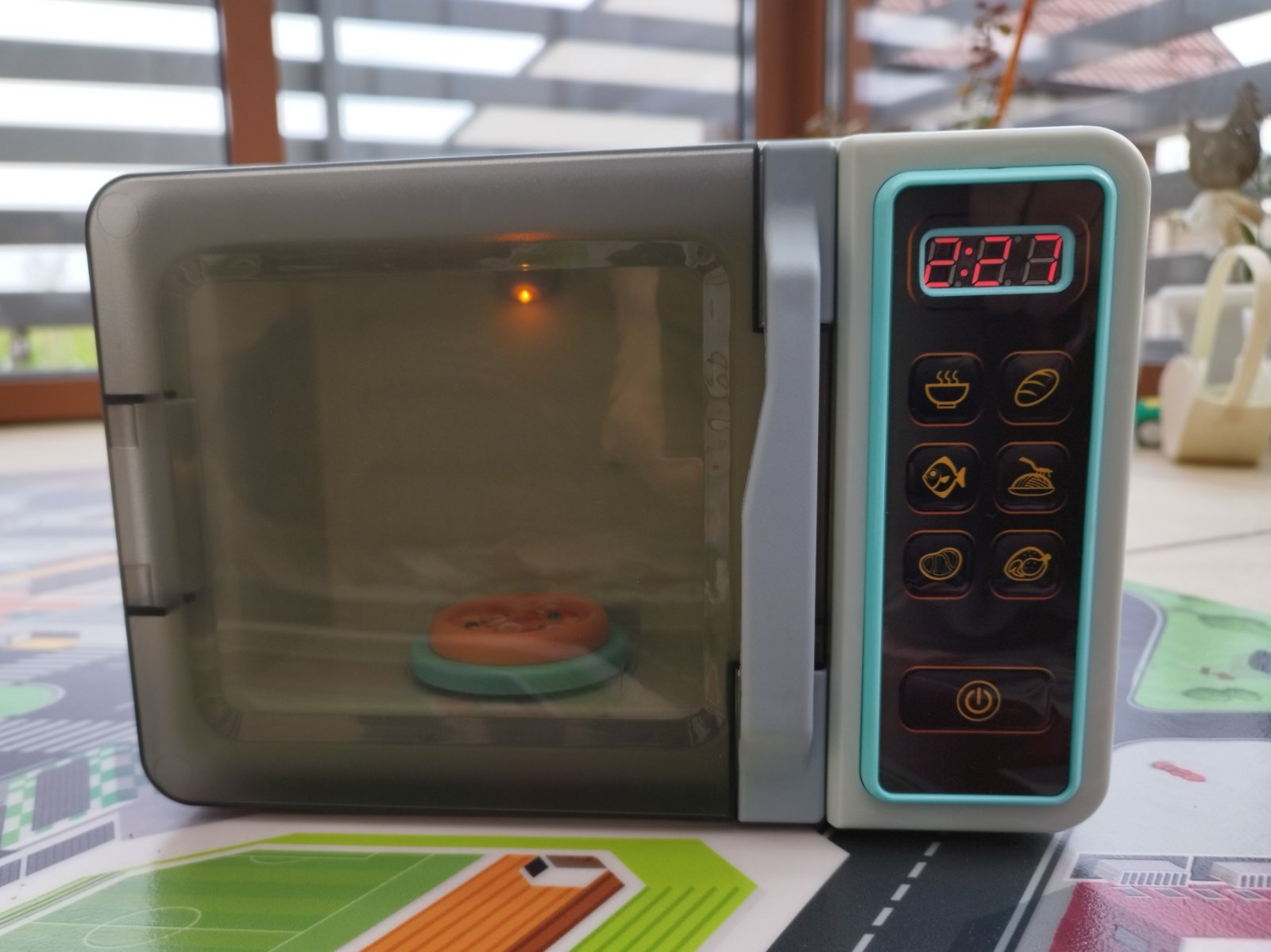 Rôzne funkcie majú rôzne časy "ohrevu", odrátava čas a na konci klasické cinknutie. Pri ohrievaní sa točí tanierik a vydáva zvuk. Tlačítka tiež pípajú pri stlačení. Všetko ako pri skutočnej mikrovlnke.