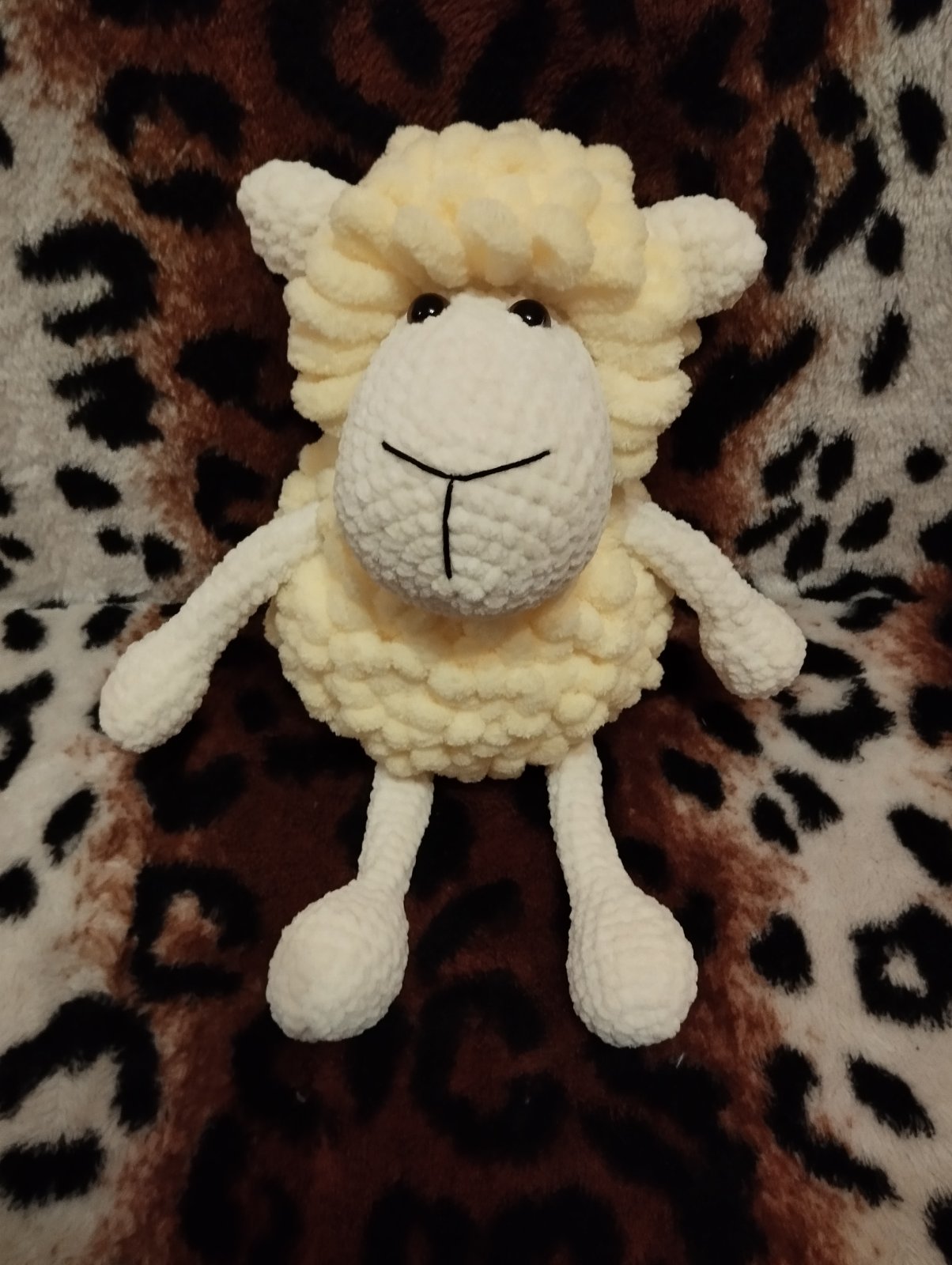 Nová háčkovaná ovečka jemnej žltej farby. Výška 35 cm. Bezpečnostné oči, vnútro duté vlákno.