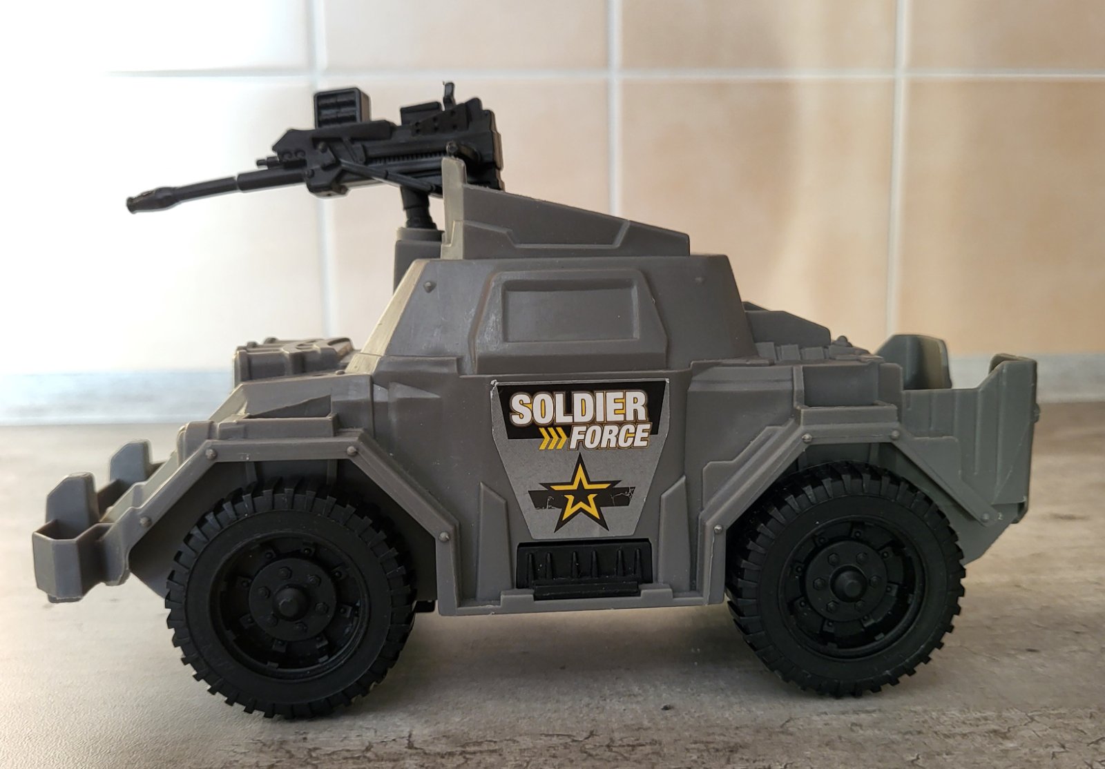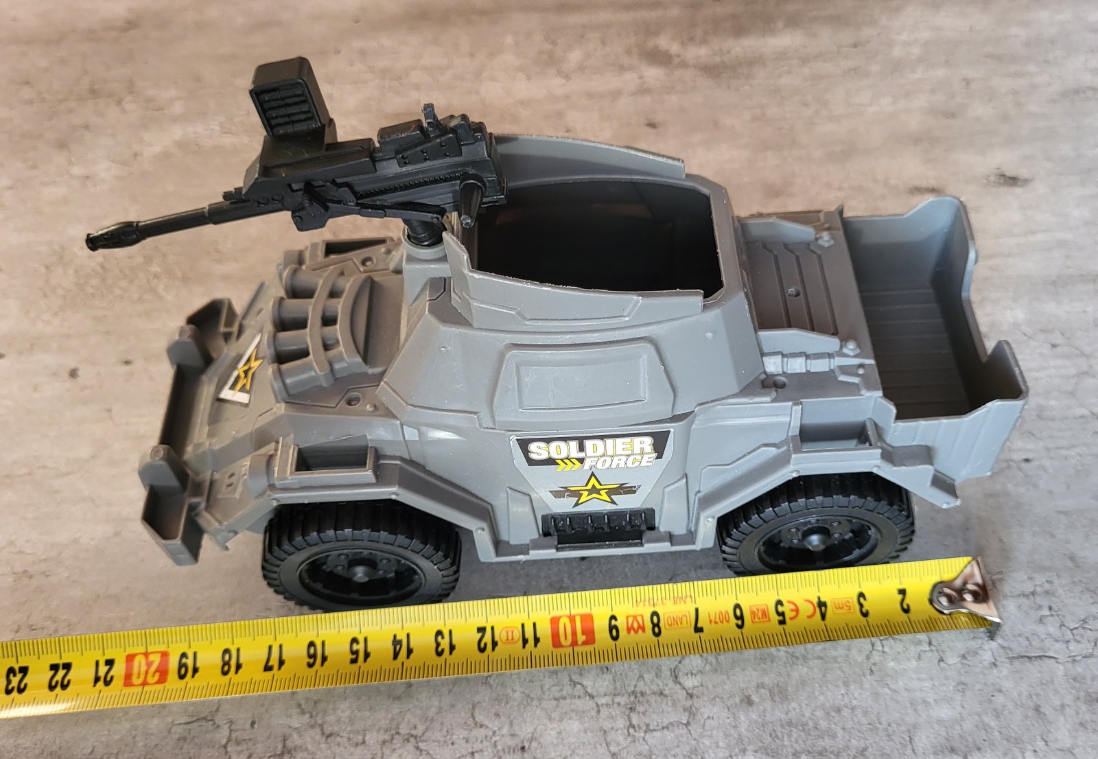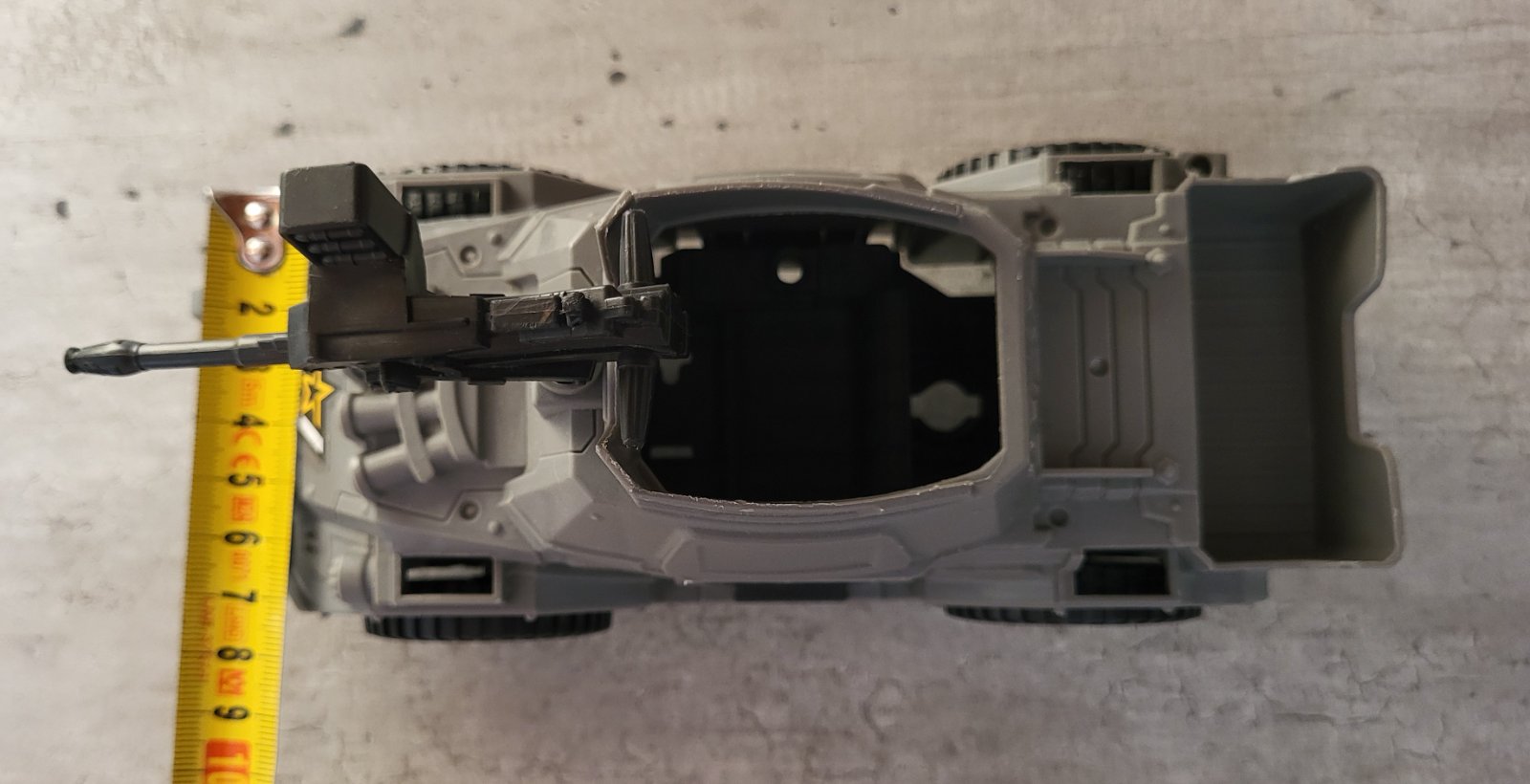veľmi dobrý stav, plastové, v kabíne miesto pre figúrku, pohyblivý samopal, rozmery na fotkách, pošlem buď poštou alebo packetou