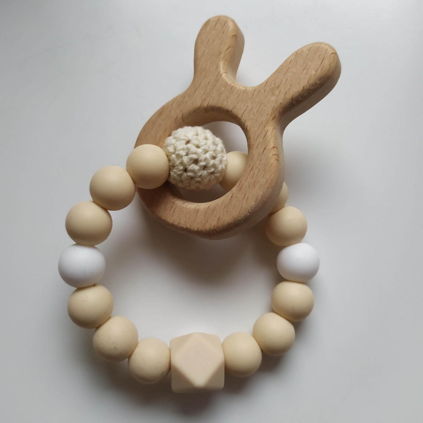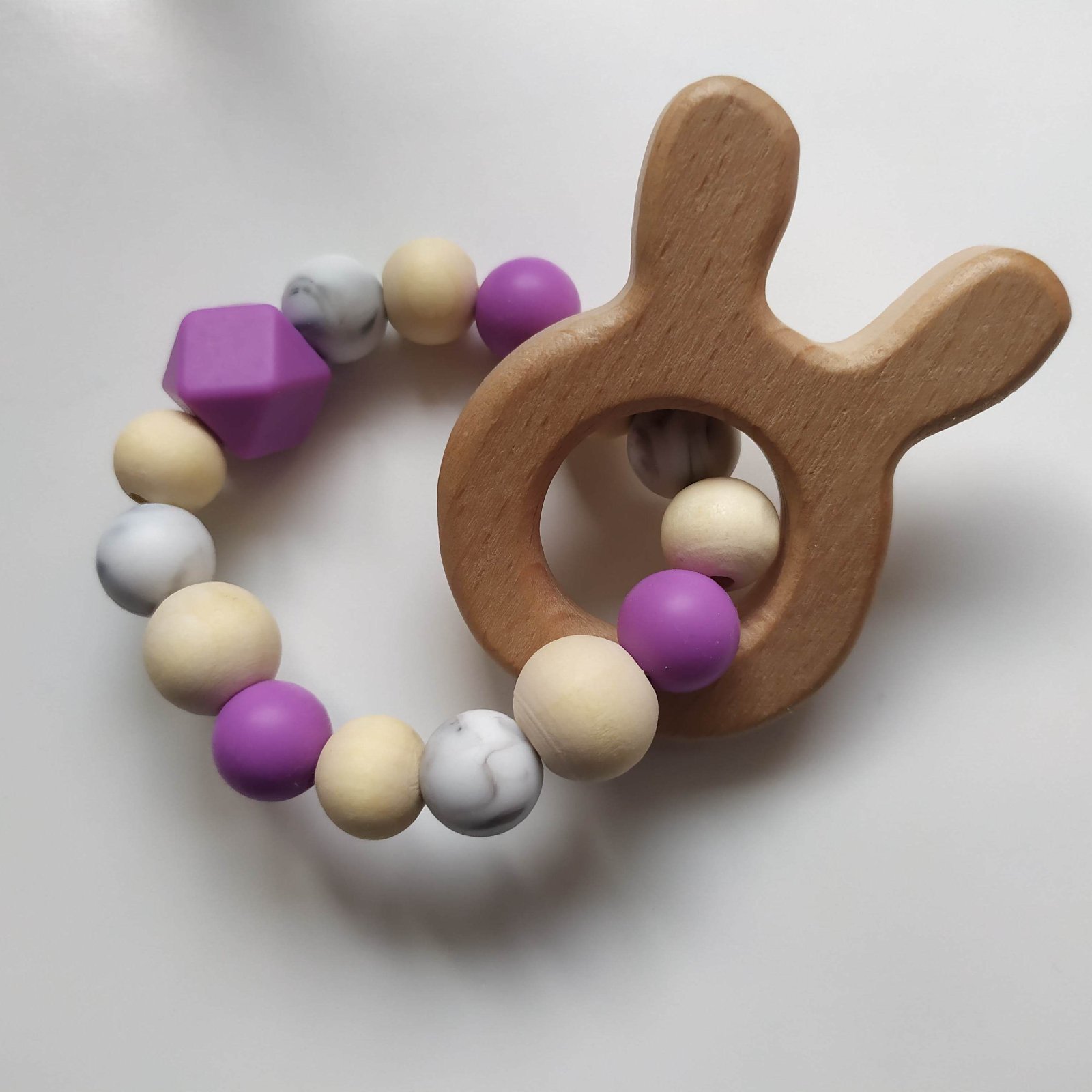 Hryzadlo s dreveným zajačikom v béžovej alebo fialovej farbe.
