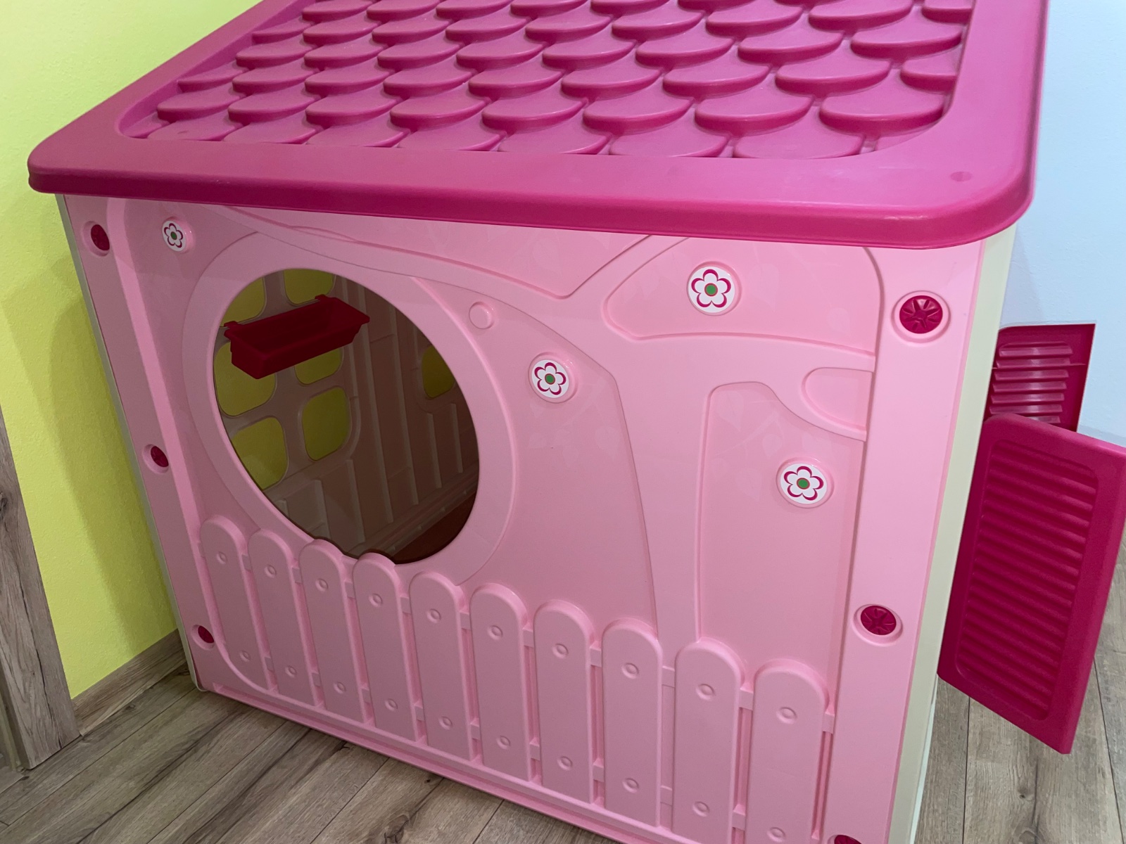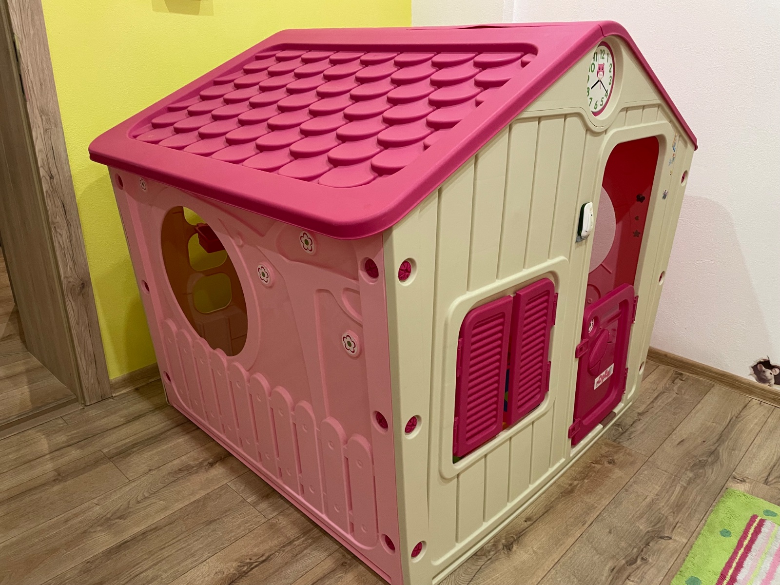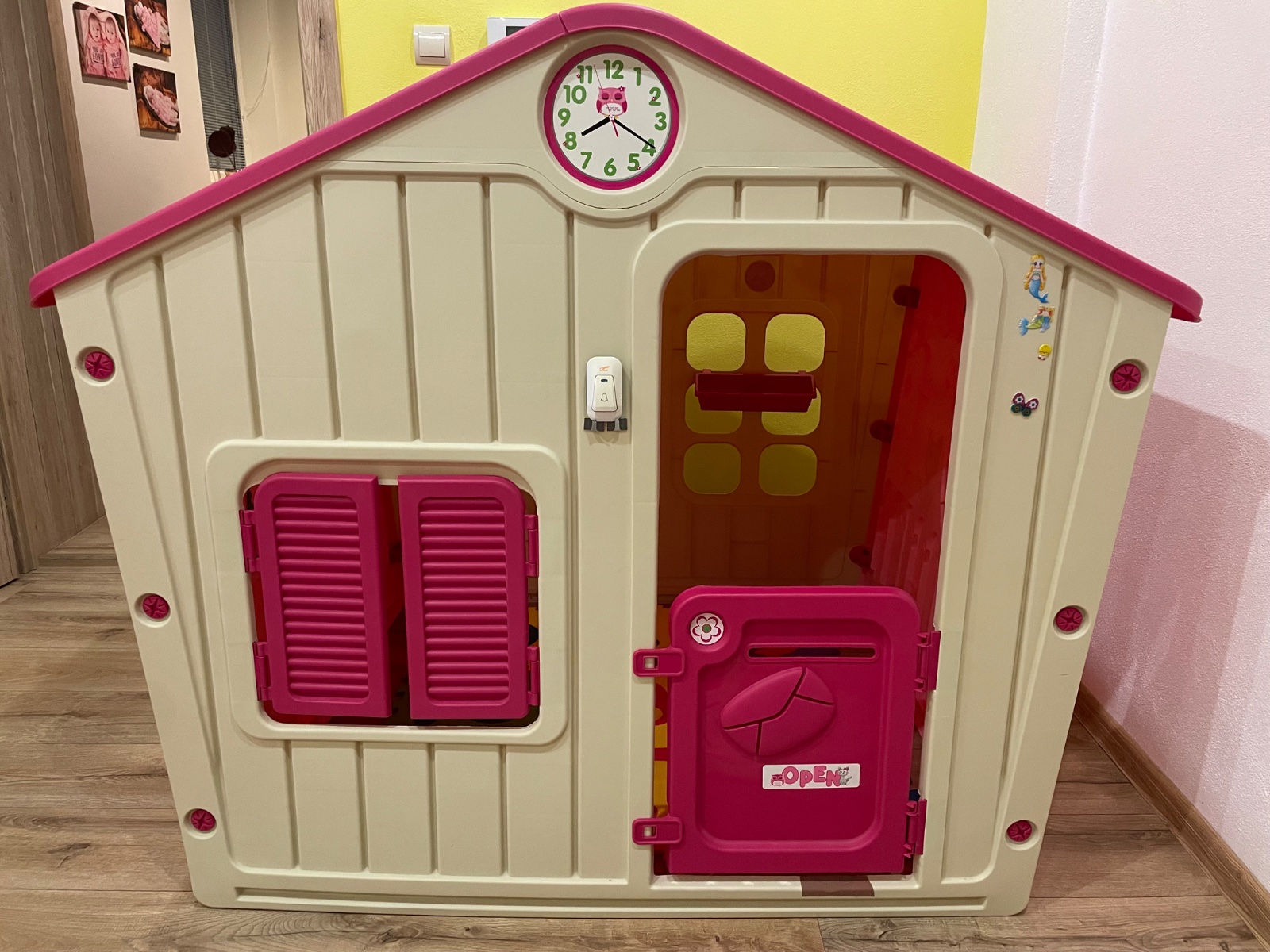 Rozmery domčeka: šírka 115 cm, hĺbka 109 cm, výška v najvyššom bode 115 cm, v najnižšom 85 cm, dvere 36x83 cm, okno 35x35 cm