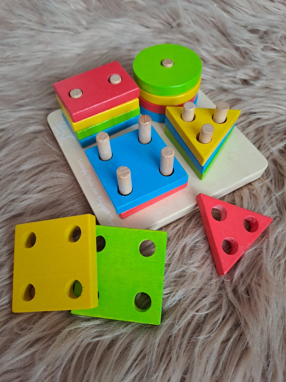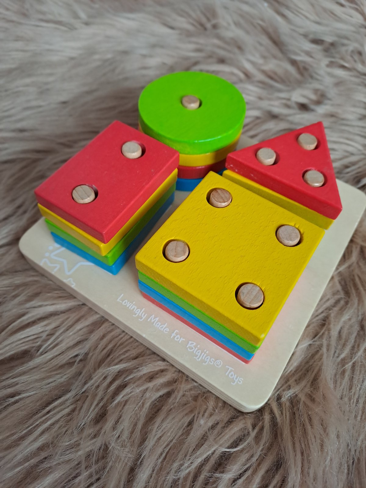 Hračka ponúka zoradenie pestrofarebných drevených tvarov do štyroch hromád. Skvelý spôsob, ako sa naučiť počítať a podporiť rozpoznávanie tvarov. Každý drevený tvar sa zasúva na kolíkovanú základnú dosku.