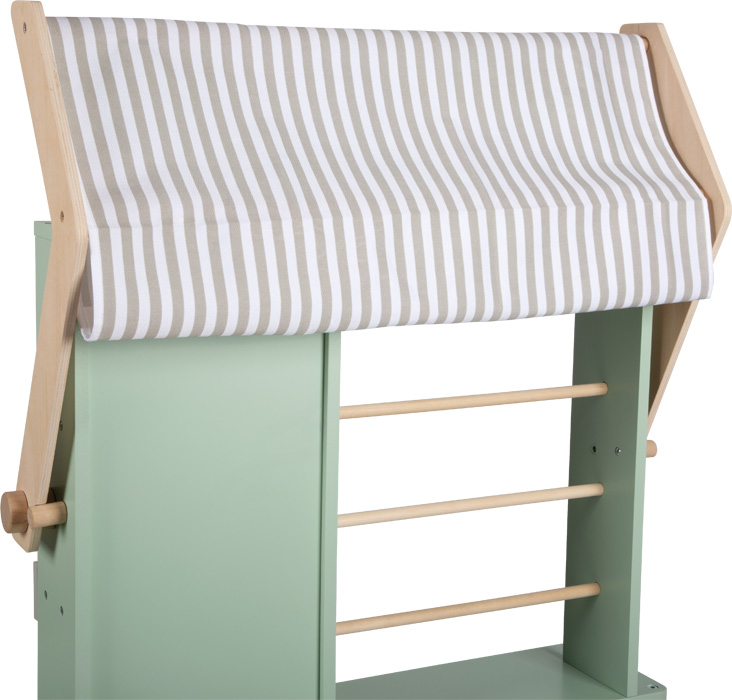 Komplexné vybavenie s pokladničným displejom/kohútikom, kávovarom, drezom/skenovacím priestorom, grilom/sporákom/pokladničným pásom a rúrou/chladničkou zaručuje realistickú zábavu pri hre. Vďaka modulárnej konštrukcii je možné prvky flexibilne usporiadať tak, aby mohlo hrať viacero detí naraz. Po dni plnom predaja a varenia sa stojan dá zložiť, aby šetril miesto. Detaily ako odnímateľný kryt markízy, predajné košíky, cenovky a tabuľa s ponukou, ako aj severský dizajn v trendy pastelovo zelenej farbe robia z tohto všestranného pomocníka ozdobu detskej izby.