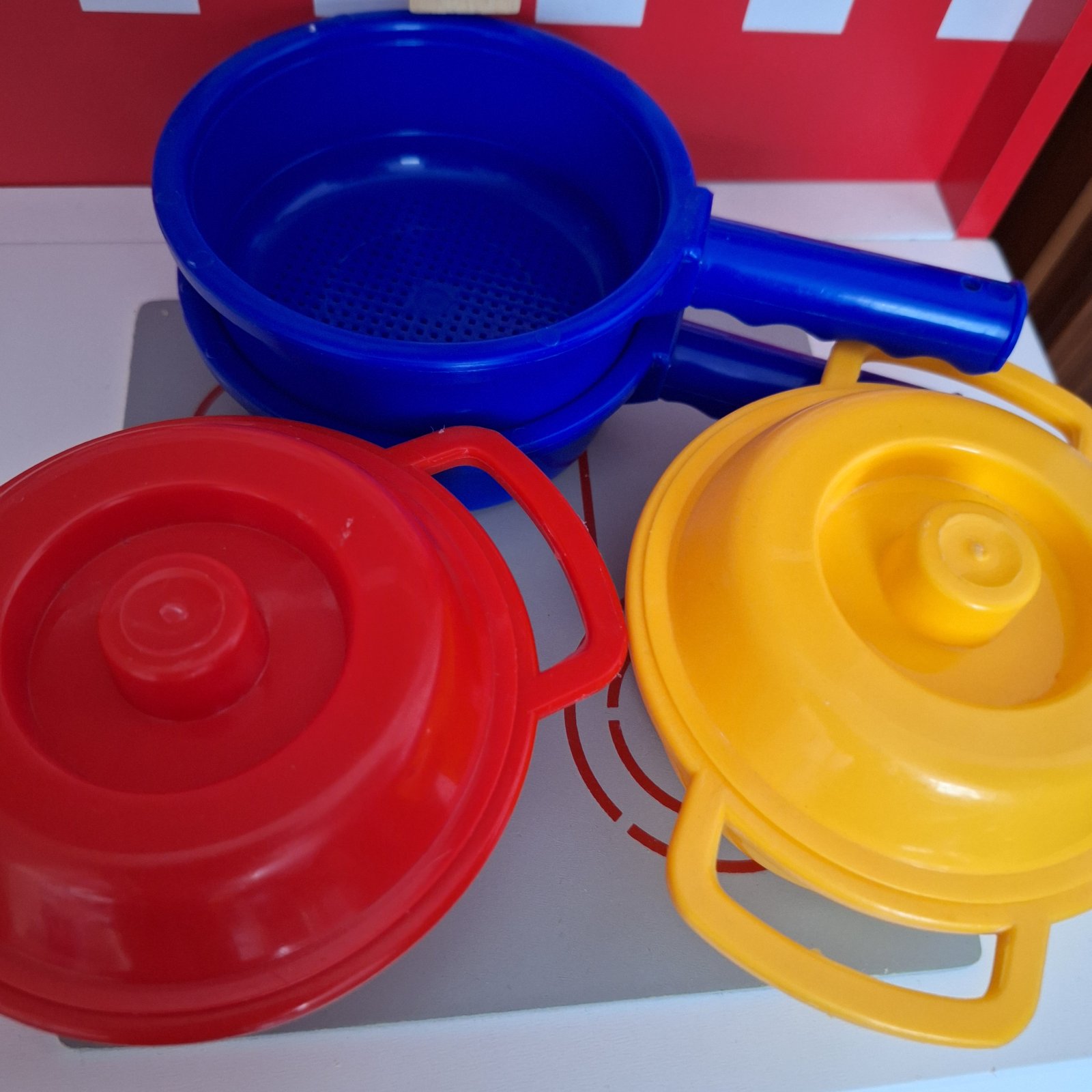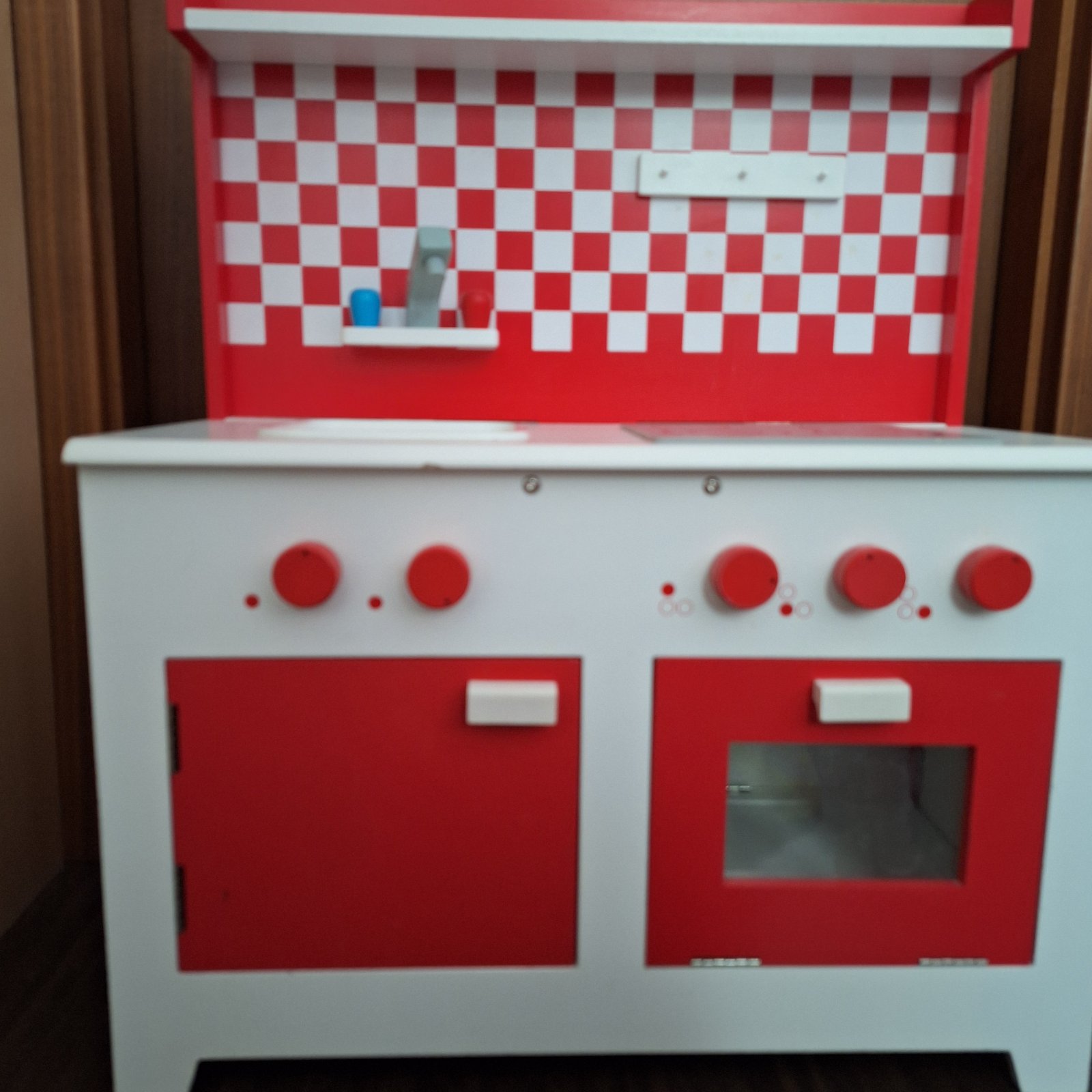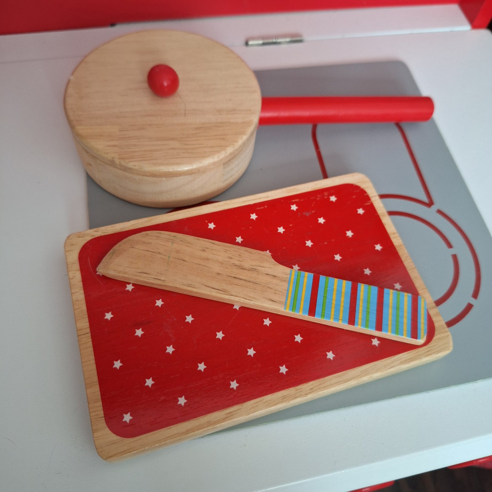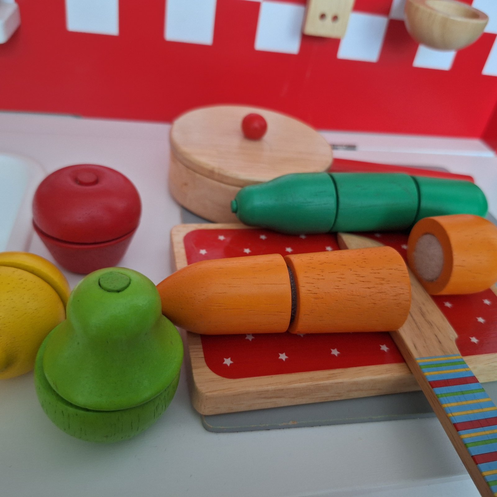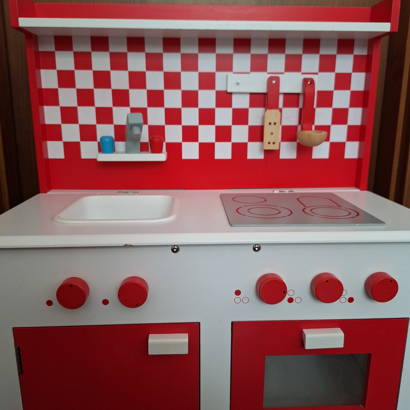 Predám detskú drevenú kuchynku so všetkým na fotkách. Kuchynka je z Tchibo. Používaná a veľmi zachovalá. Viď fotky. Drevená zeleninka a ovocie, ktoré sa dajú krájať - sú na suchý zips, zástera atď.. Najlepšie osobný odber, v rámci BA aj doveziem.