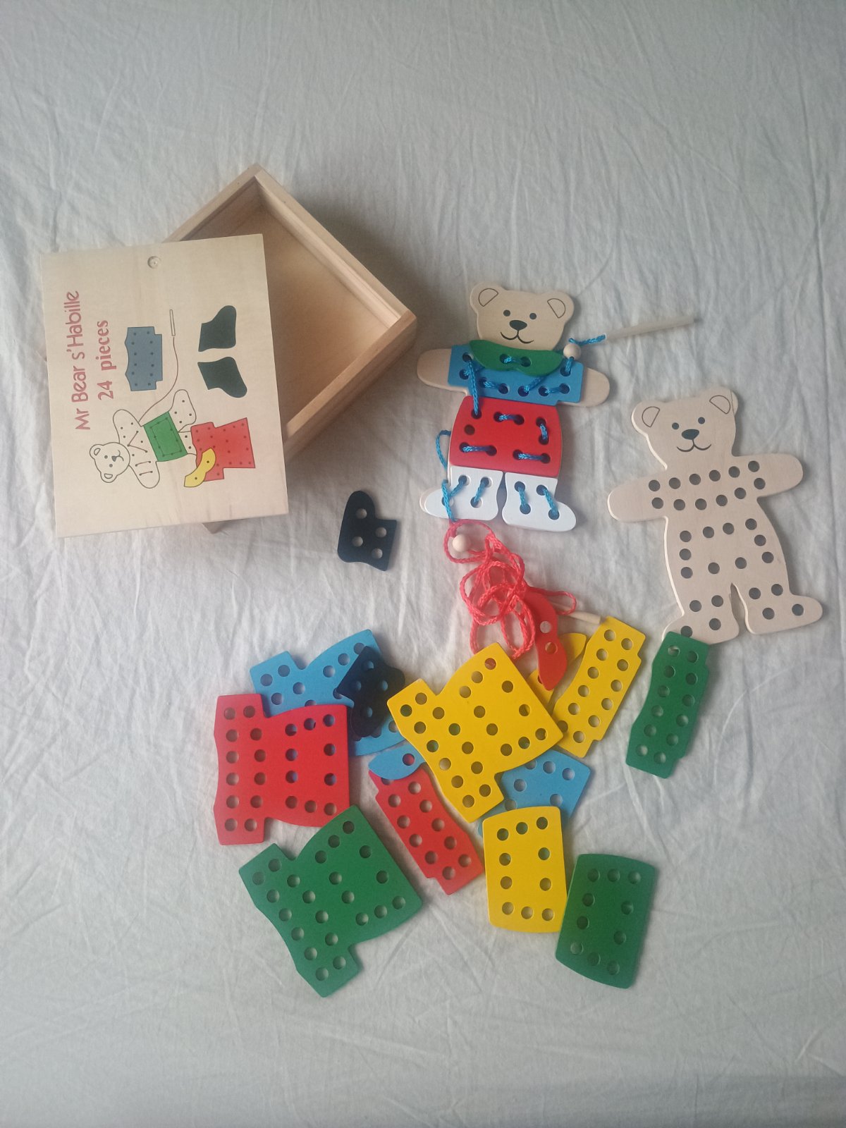 Šnúrky treba prezliecť cez dierku a tak obliecť šaty a príslušenstvo. Navliekaním deti trénujú jemnú motoriku.