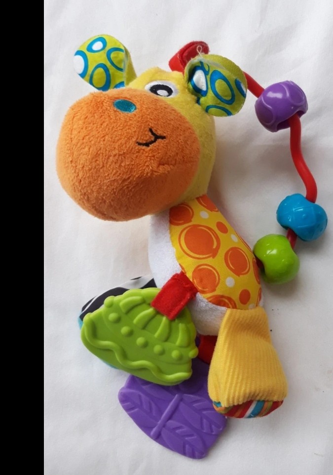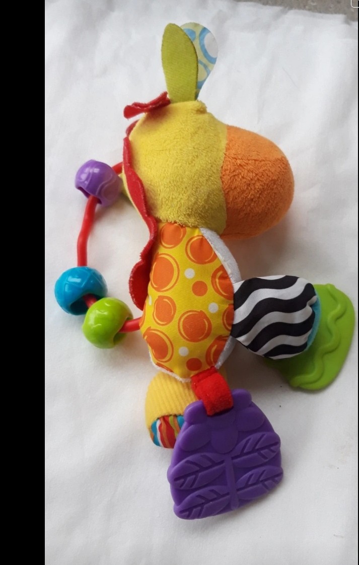 Žuvaním nožičiek môže drobček utíšiť bolesť spôsobenú rastúcimi zúbkami. Rôzne dotyky a zábavné farby rozvíjajú vnímanie bábätka.Možno zavesiť na postieľku a kočík.Rozmer: 23 x 14 x 8 cm.