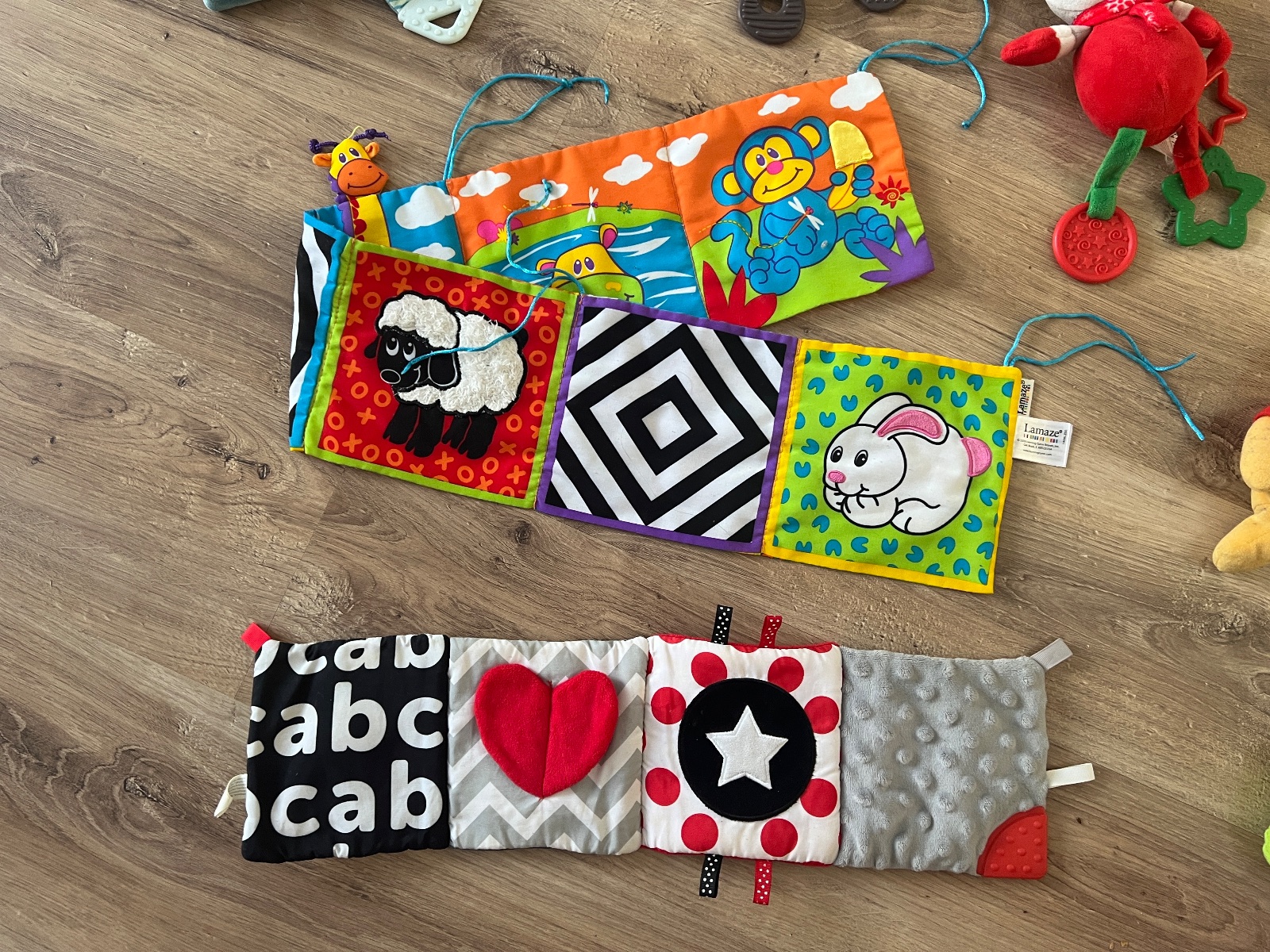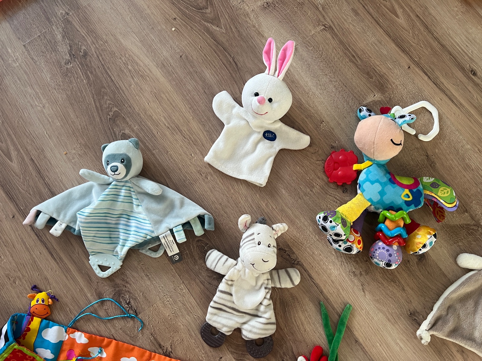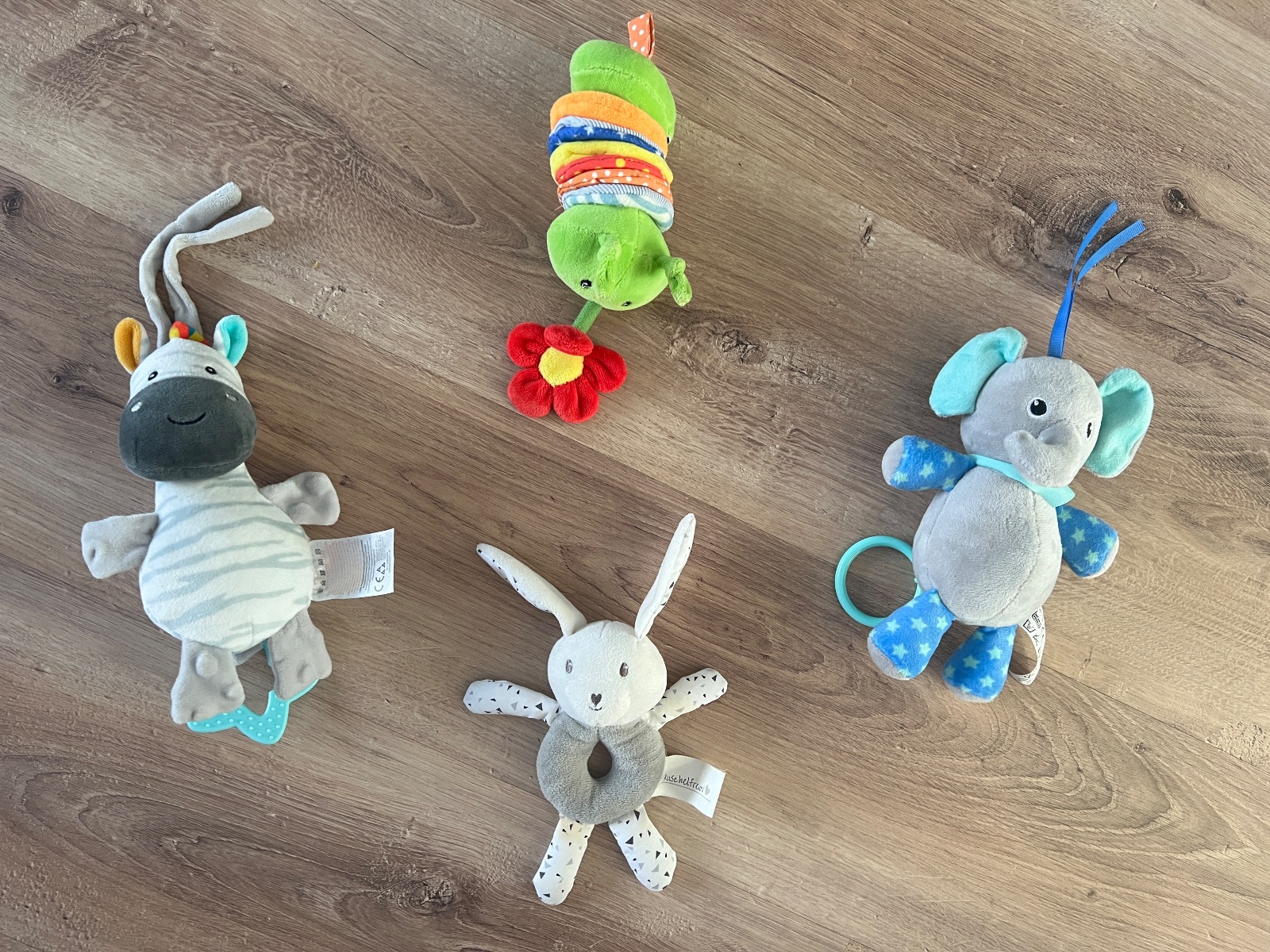 Naťahovacie hračky. Sloník a zebra hrajú keď sa potiahne šnúrka a v strede hore húsenica vybruje keď sa natiahne a zajko hrká. Cena symbolická, budem rada ak ešte hračky potešia iné bábätko.