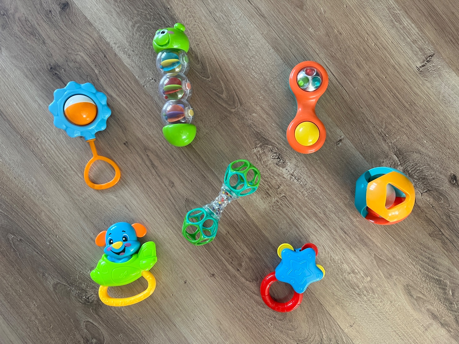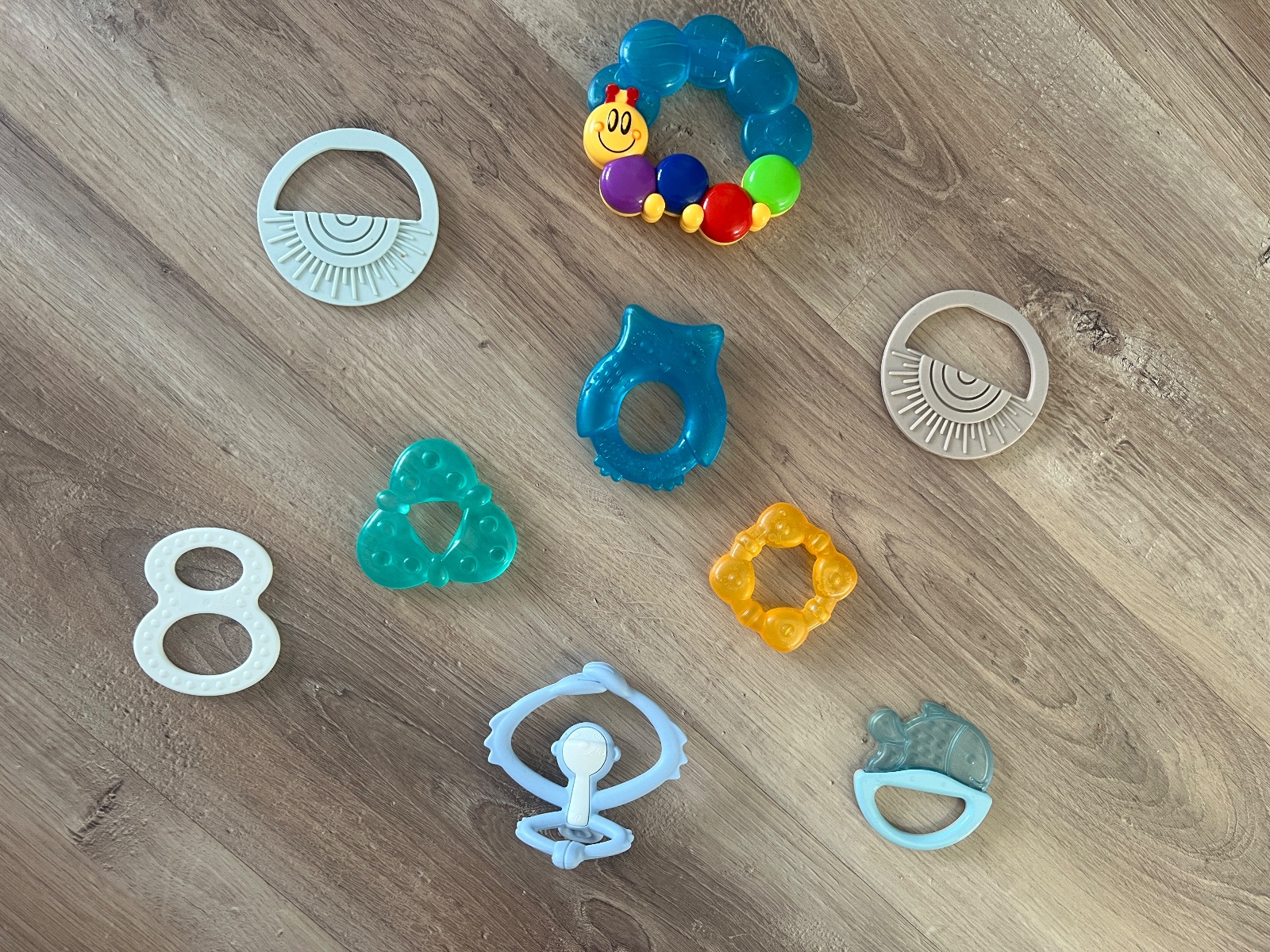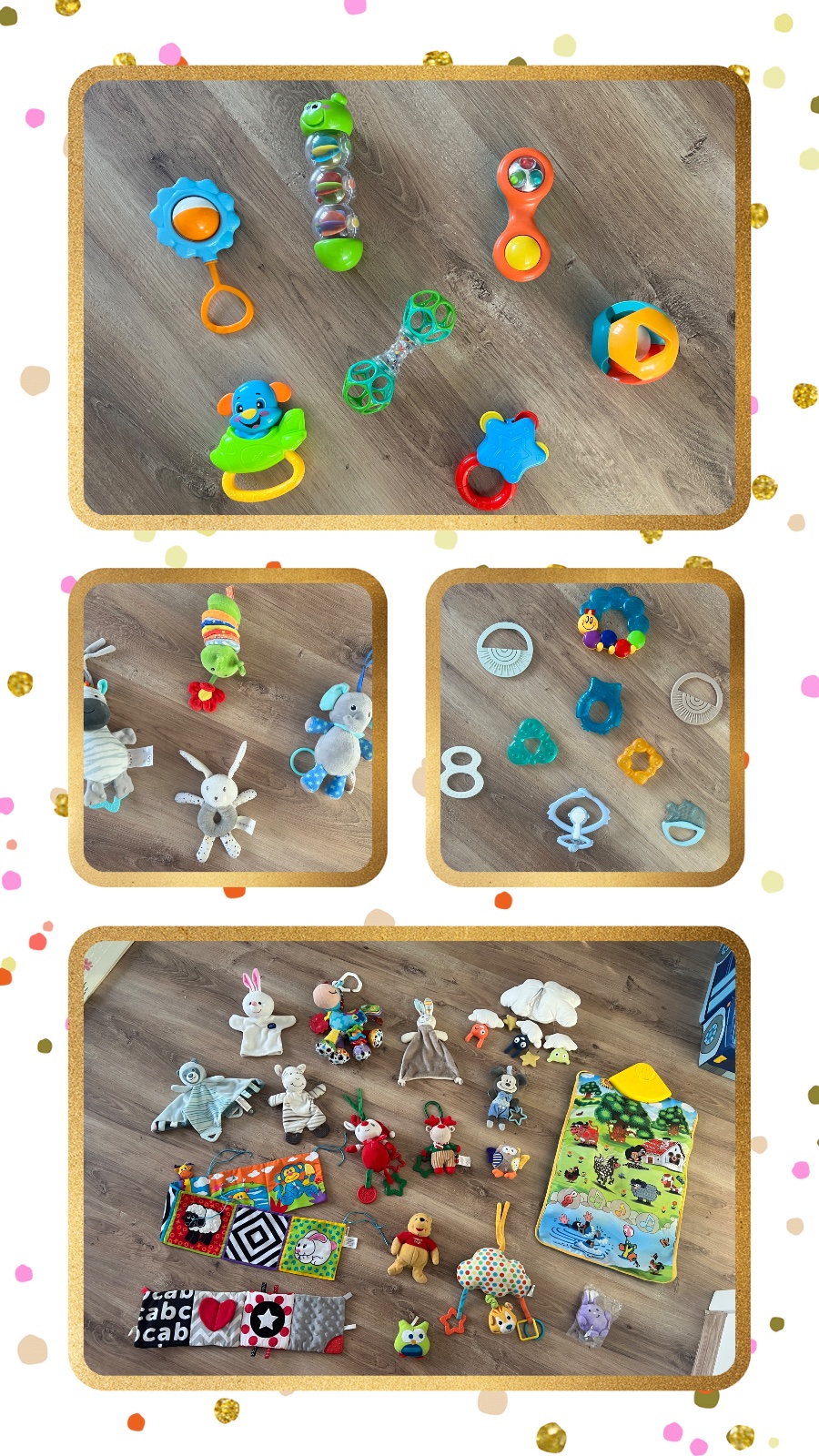 Naťahovacie hračky. Sloník a zebra hrajú keď sa potiahne šnúrka a v strede hore húsenica vybruje keď sa natiahne a zajko hrká. Cena symbolická, budem rada ak ešte hračky potešia iné bábätko.
