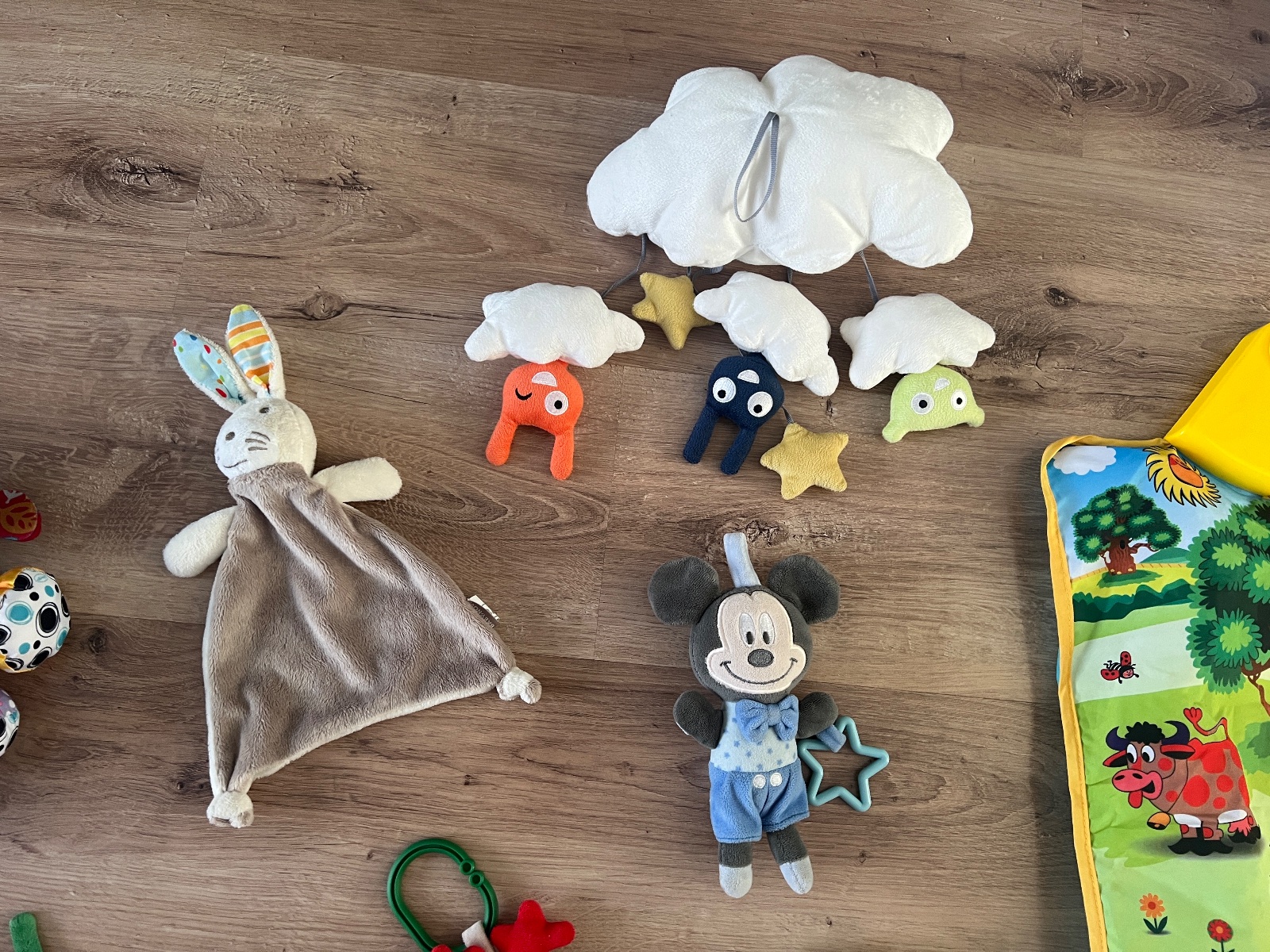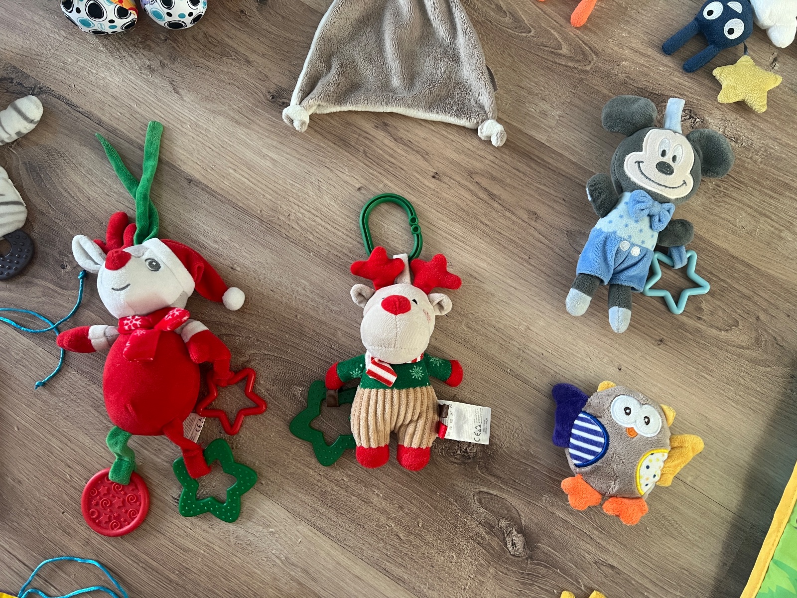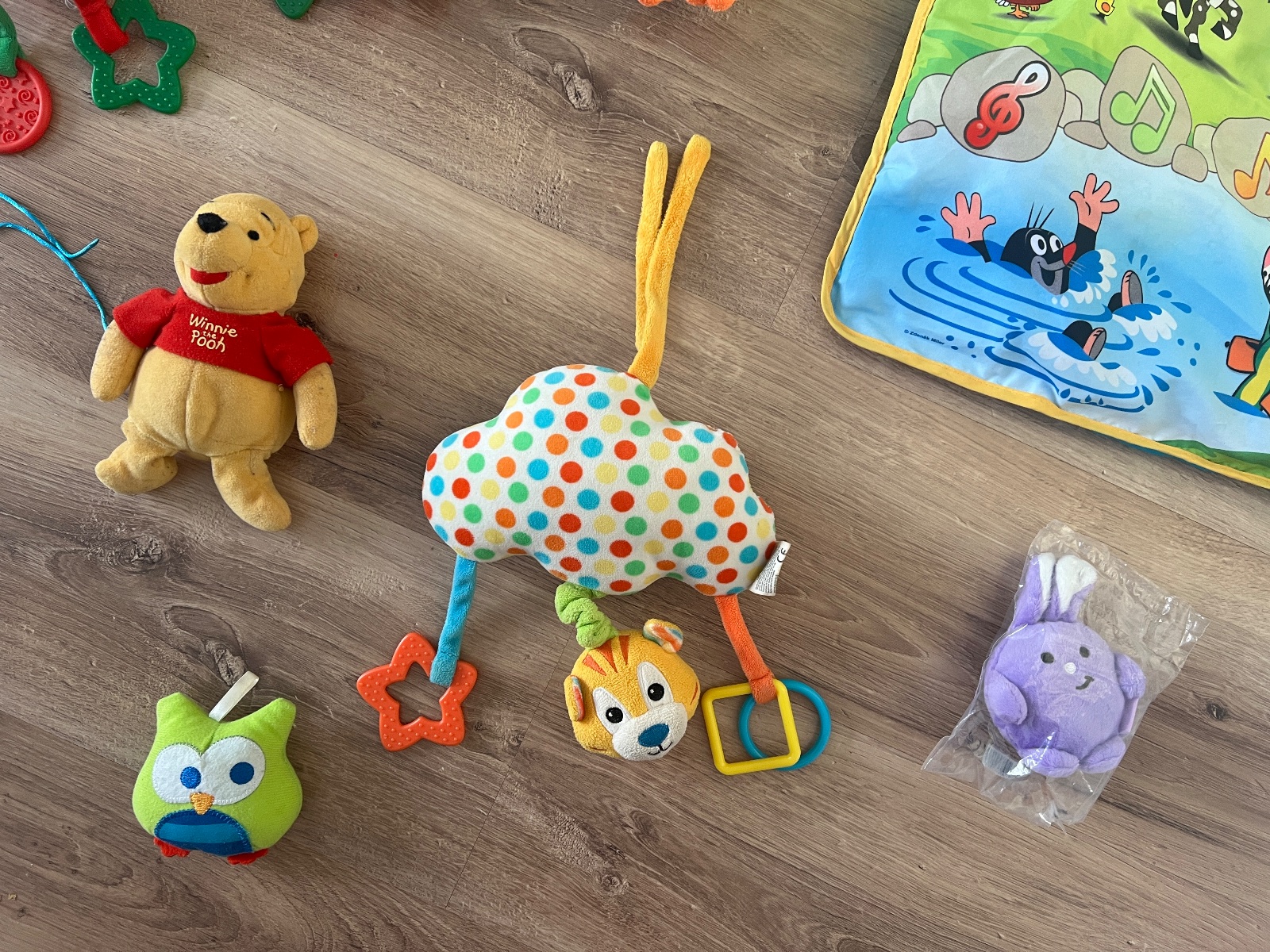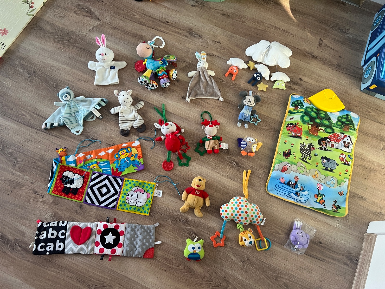 Mix hračiek. Zvuková deka neviem či funguje a jedna závesná hračka čudne hrá. Ináč ostatné hračky pekný stav. Playgro závesná hračka zebra, mini sovičky, zajko ktorému šuštia ušká a zebra, modrá Minie a iné.