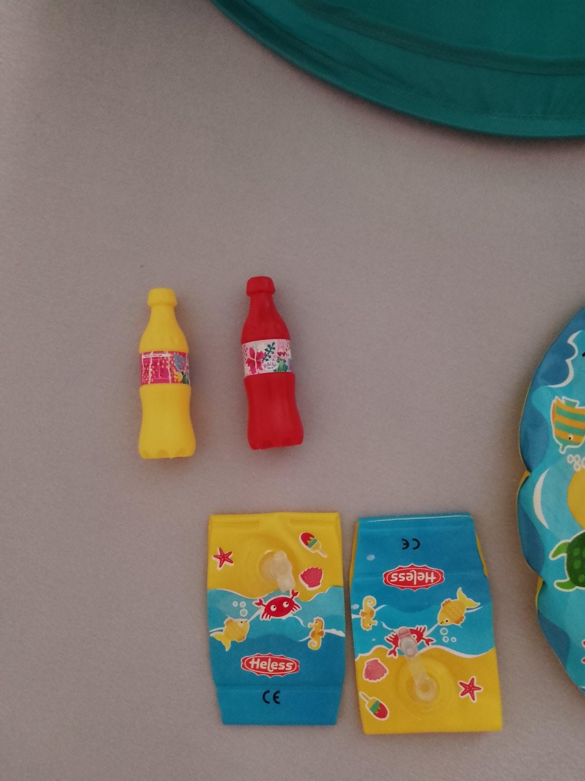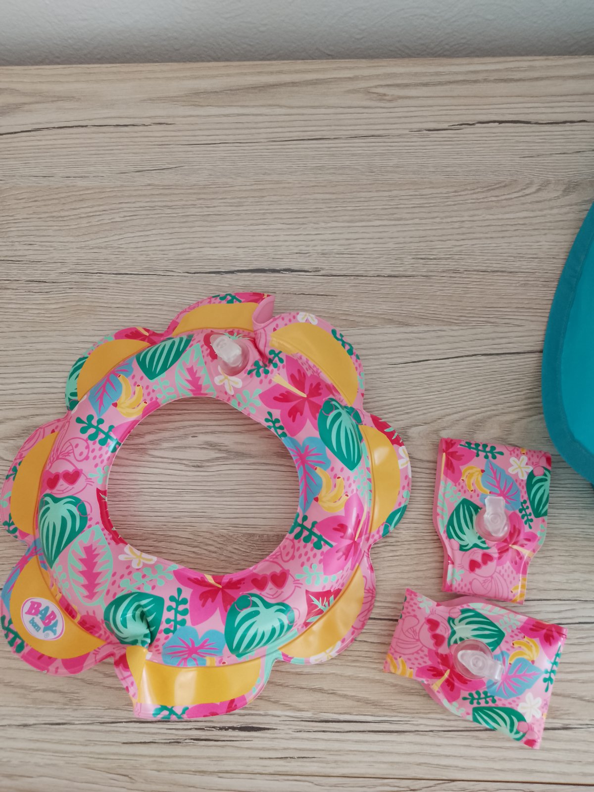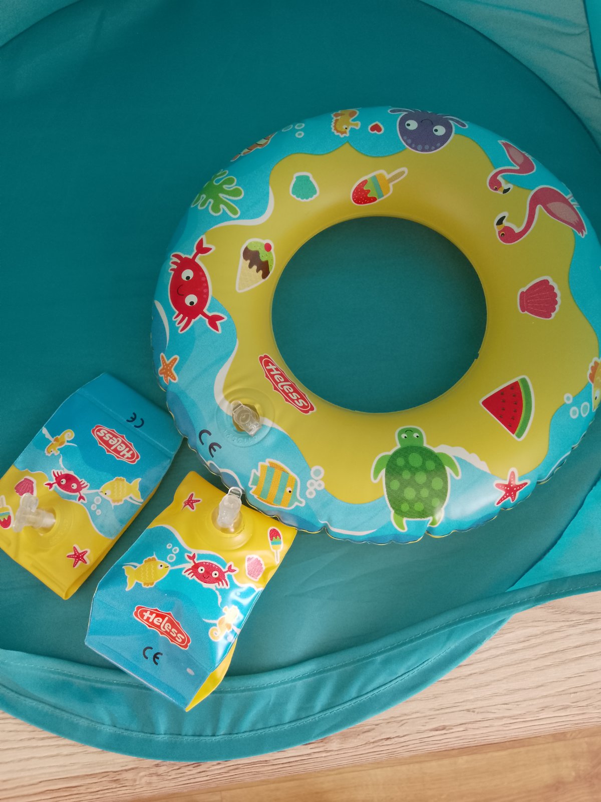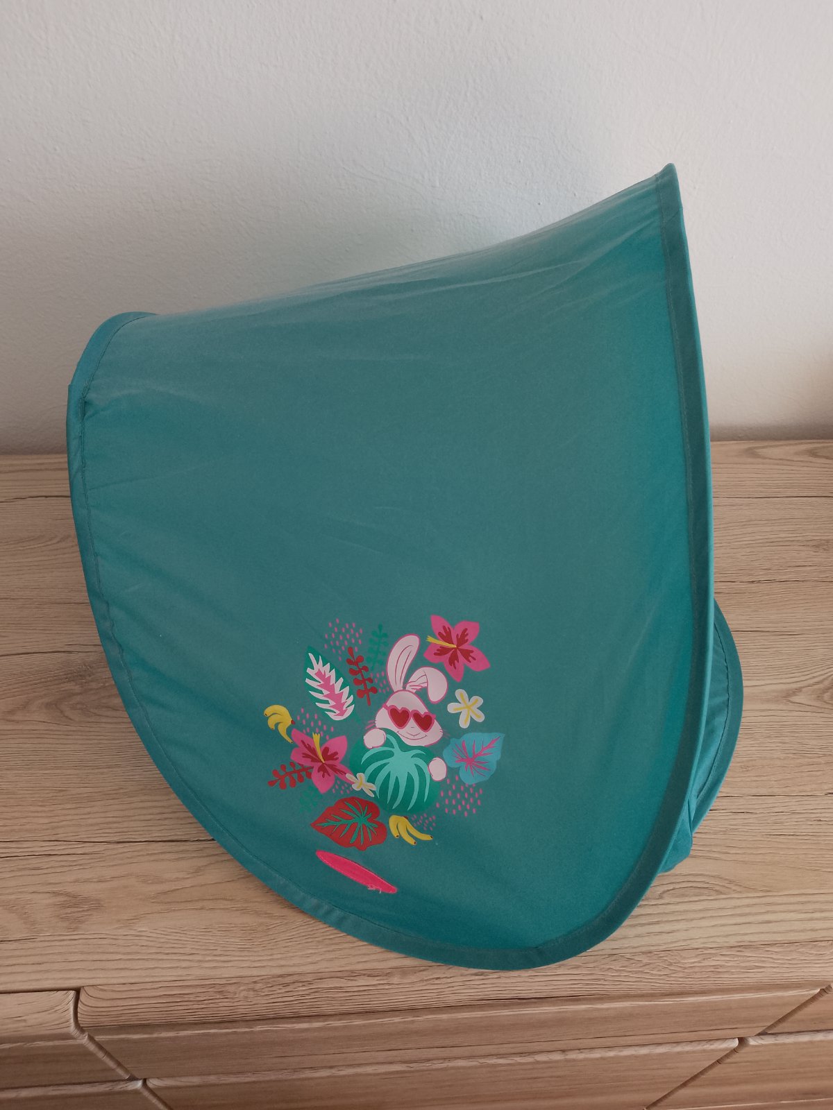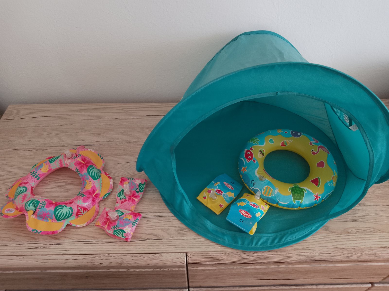 Plážový stan + príslušenstvo ( 2x nafukovacie plávacie koleso a 4x nafukovacie rukávniky pre bábiku + 2x fľaša) v super stave. Používané málo. bez poškodenia, dier a fľakov. Rozmery - viď foto. Stan nie je vyblednutý, len sa mi to nedá lepšie nafotiť. Kupovali sme ako doplnok na hranie k bábike baby born.