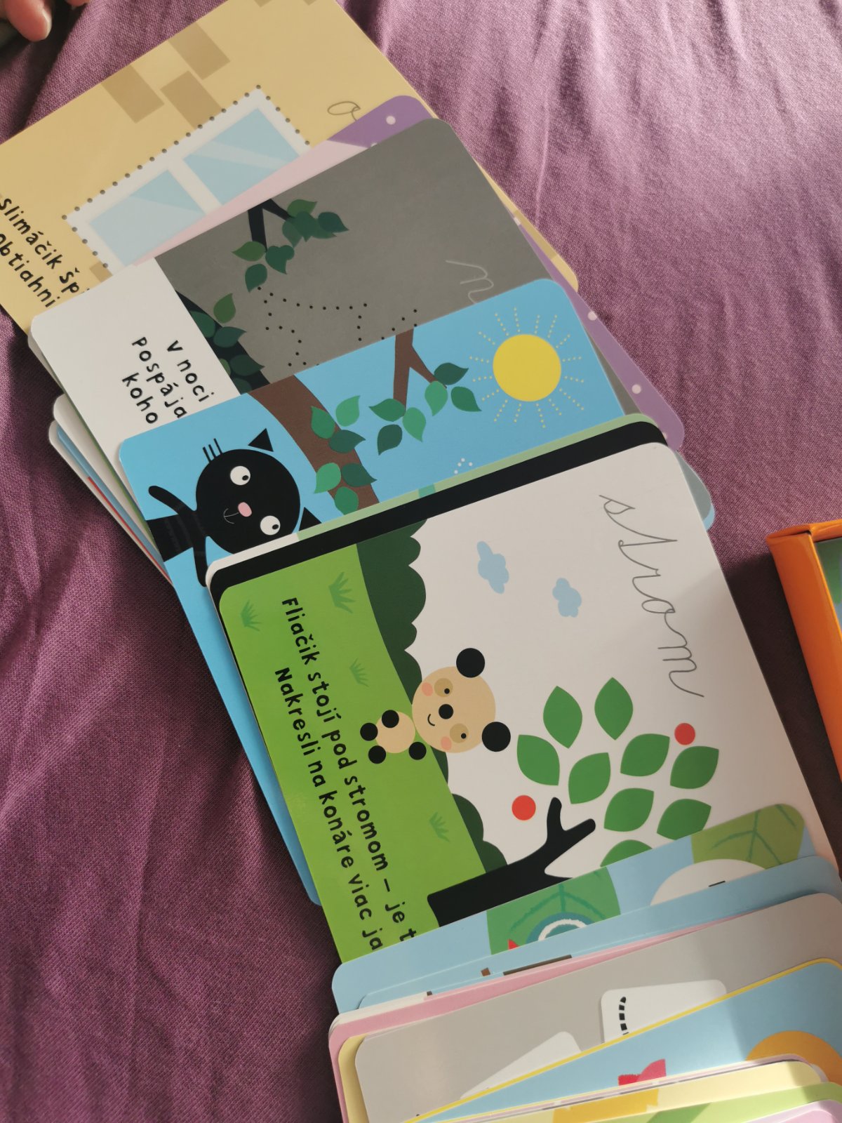 Je to interaktívna pomôcka, ktorá umožňuje deťom opakovane písať a kresliť priamo na karty.