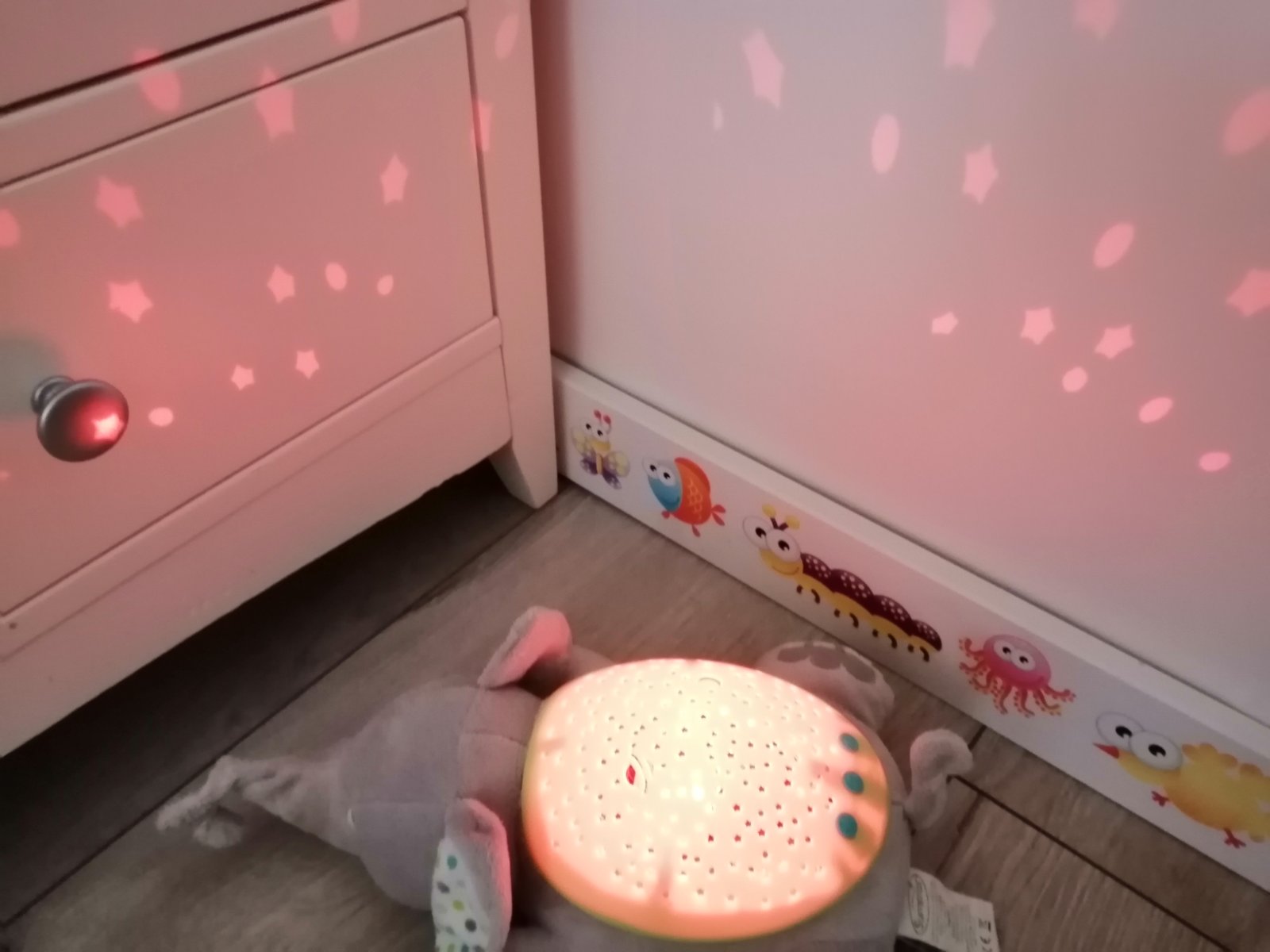 Plne funkčný, výborný stav, len nosík jemne ožužlaný 🙂. Vrátane batérií. Svieti farebne, podľa výberu, tri melódie, tlkot srdiečka a šum mora.... Cena nového cca 35e