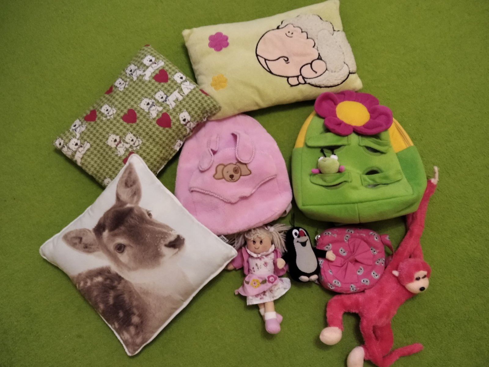 Predam mix vankušikov, dva plyšove ruksaciky, do jedneho sa daju vlozit male plysove zvieratka, aby im hlavy vykukali von, plysova opicky, mala babika. Cena spolu
