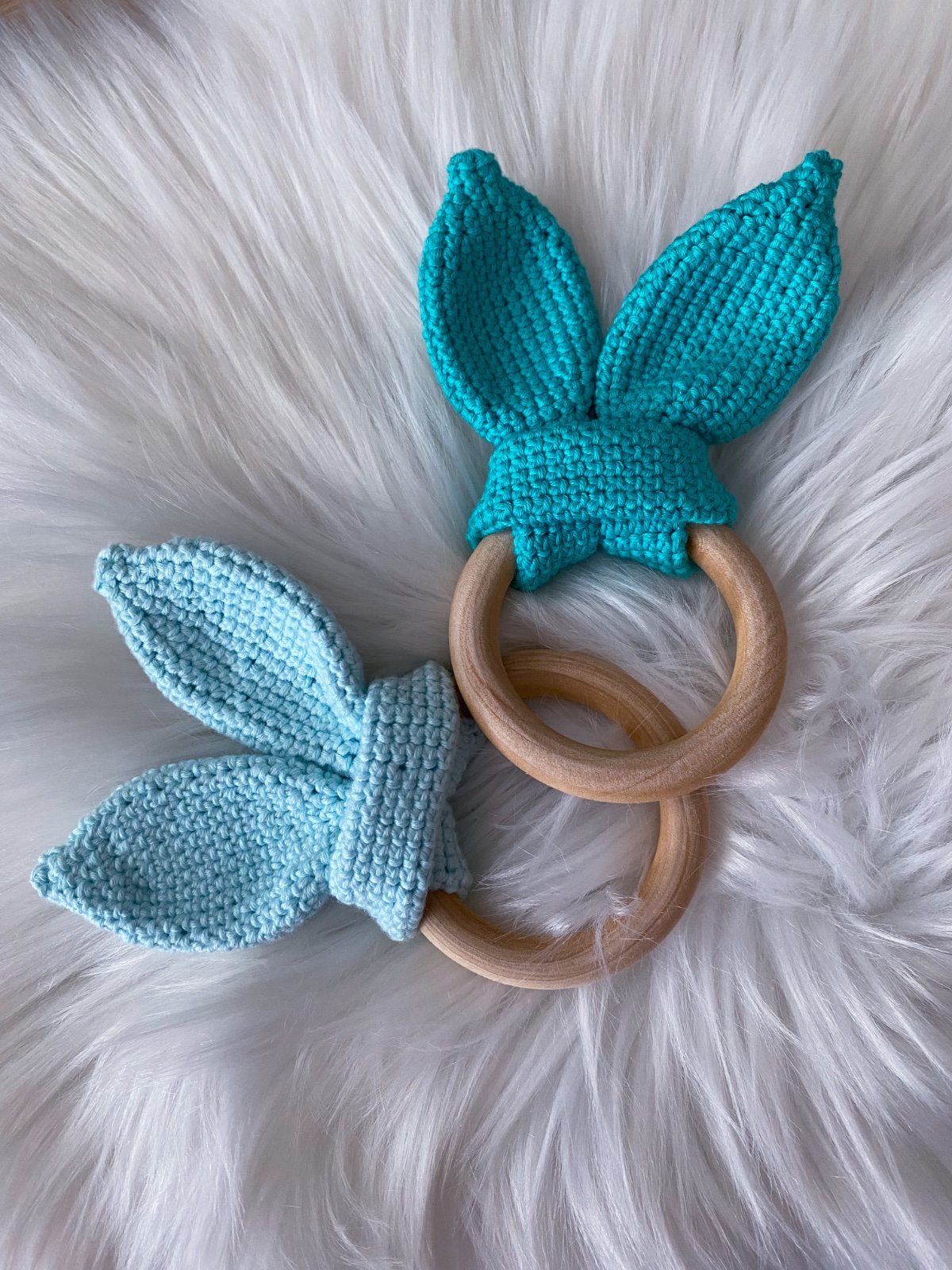 Háčkované hryzátko s drevenou rúčkou, v jednom ušku je skovaná hrkálka. Možnosť rozobrať na dve časti.