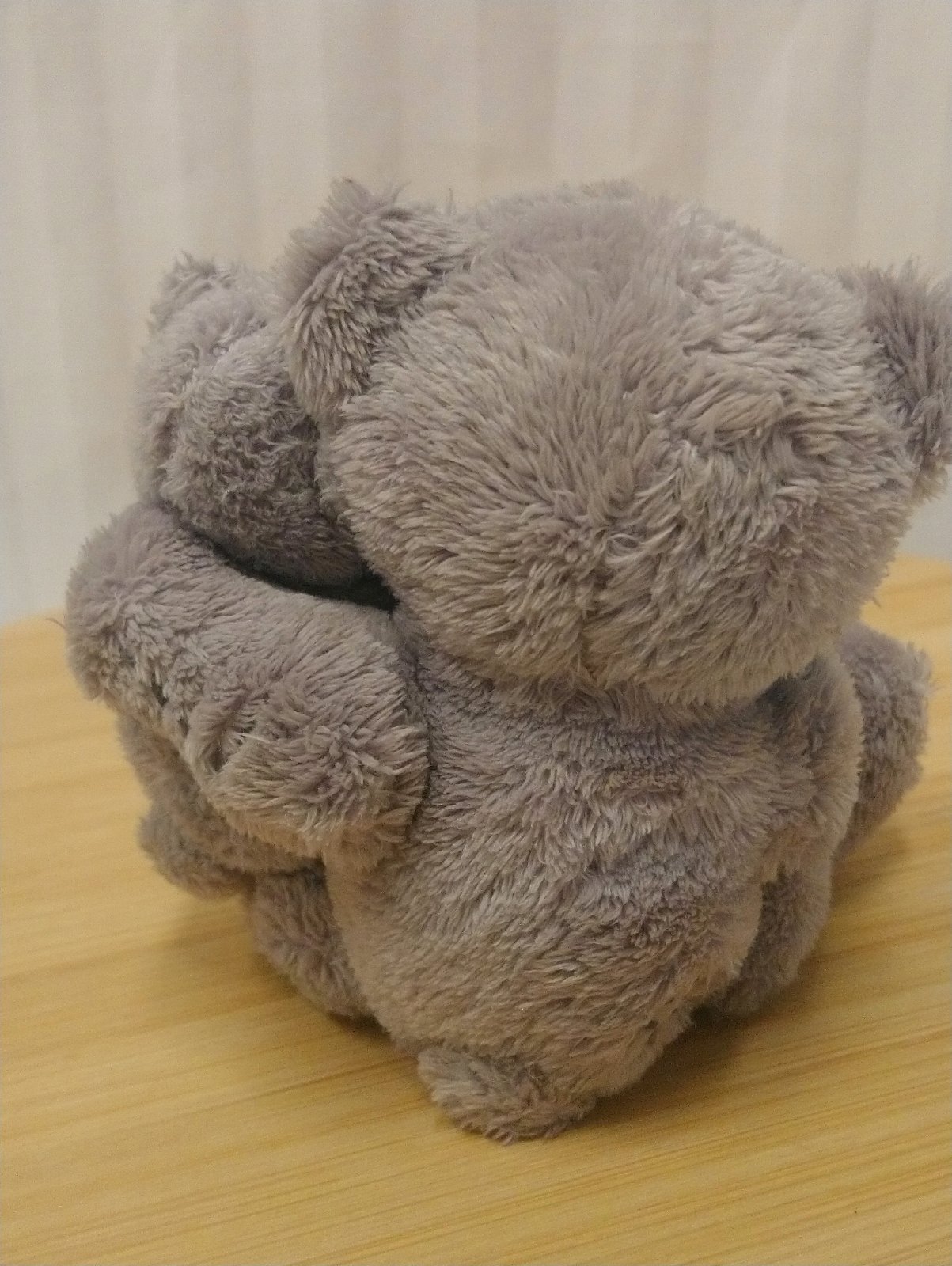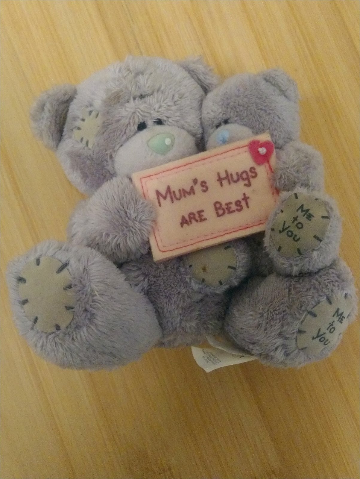 Me to you medveď s medvedíkom, mamino objatie 11cm, sediaci, je svetlo sivý, malý medvedík sedí u mamičky medvedice a držia spolu nápis Mumś hugs are best - mamine objatia sú najlepšie,