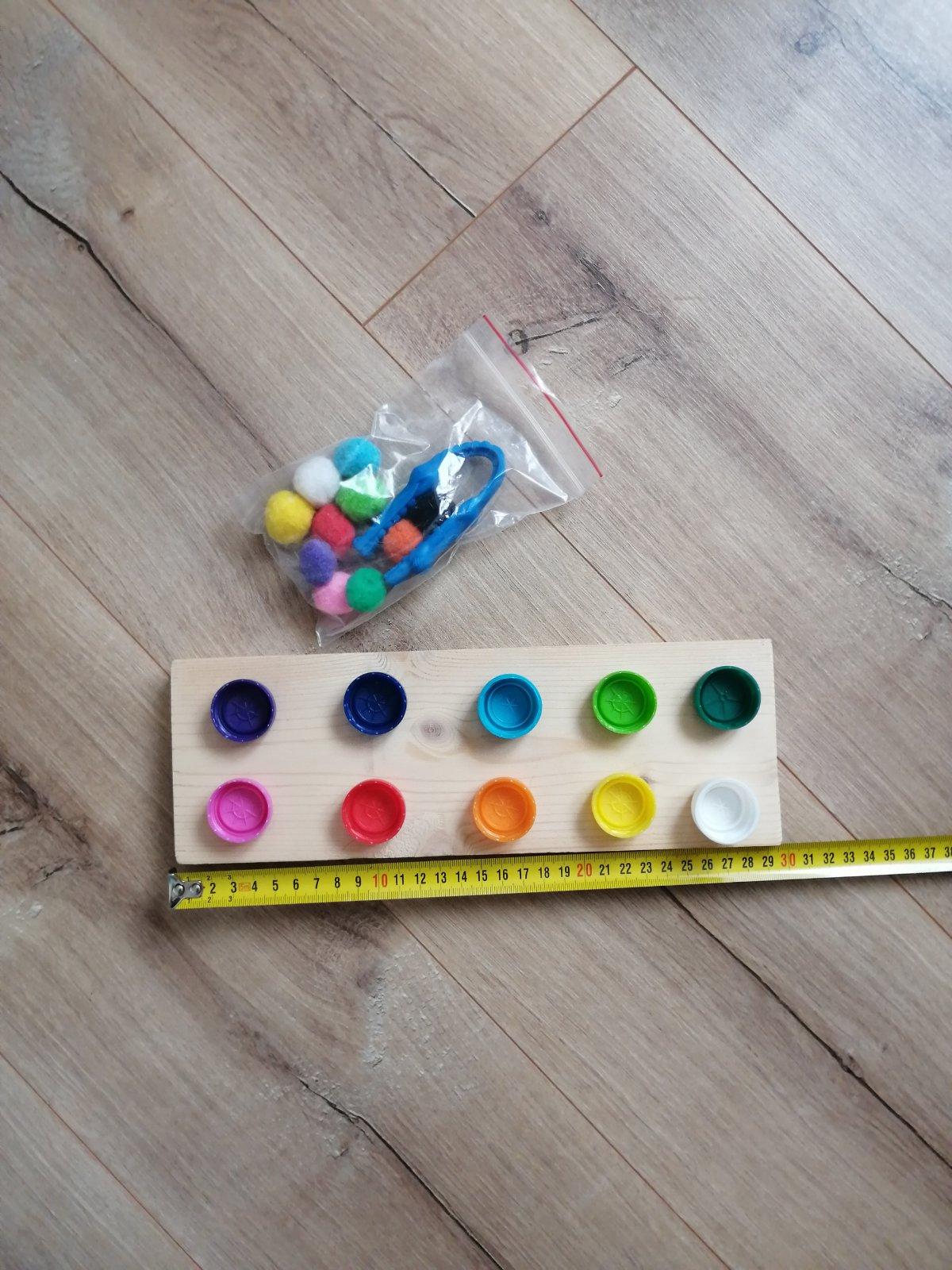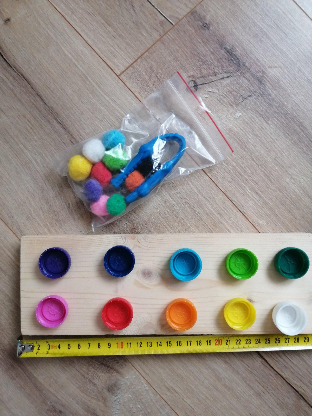 Pinzetou priraďujeme Farebné bambulky do farebných vrchnáčik ov.