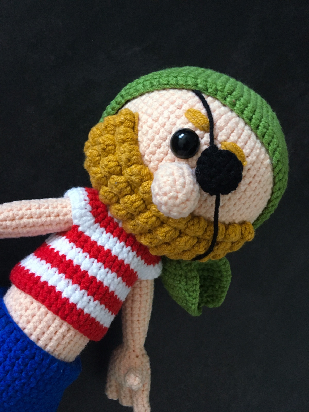 Háčkovaný pirát s mečom vhodný ako maznáčik alebo dekorácia do detskej izbičky. Uháčkovaný z príjemnej zmesovej vlny, vyplnený dutým antialergickým vláknom. Očká sú bezpečnostné.
